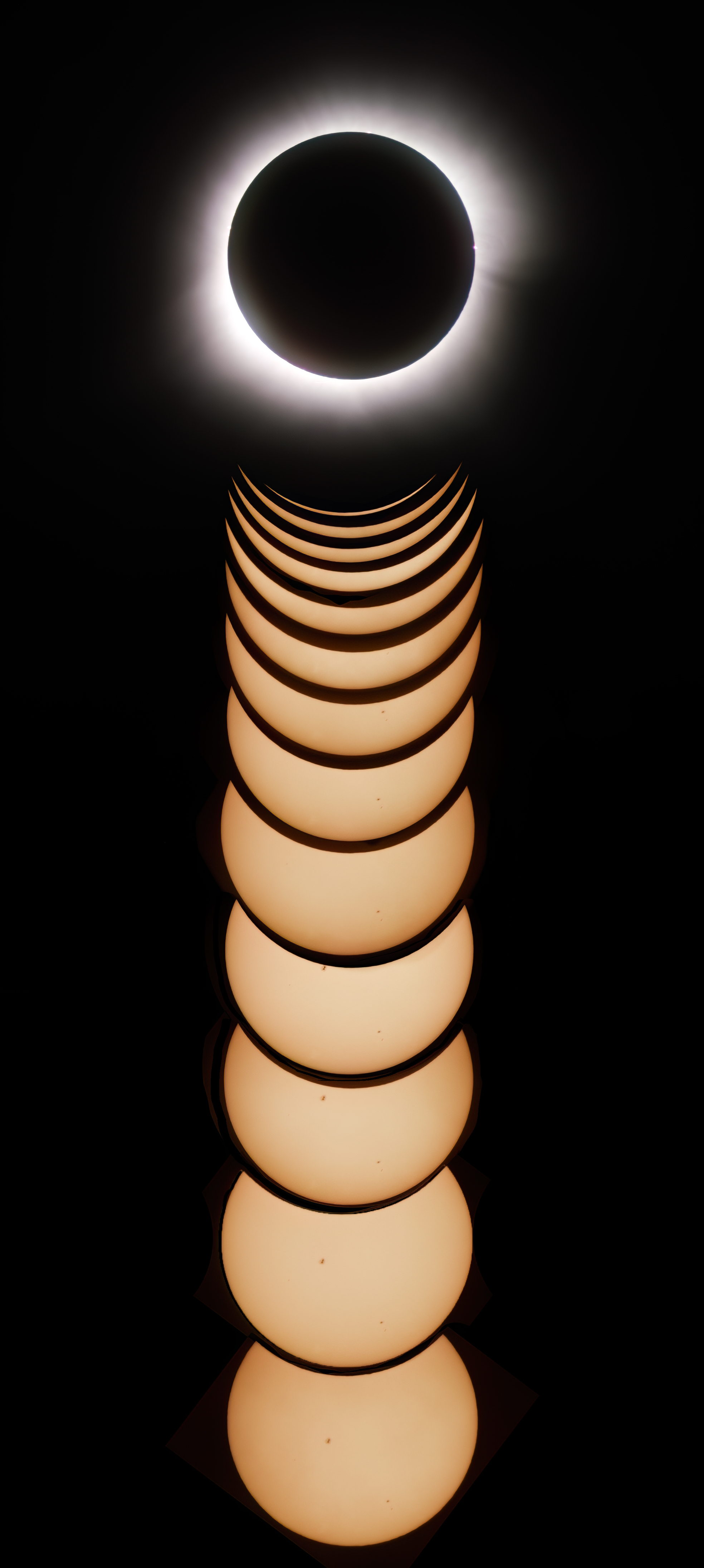 Diese Bildcollage zeigt sehr schön, wie der Mond die Sonne immer mehr bedeckt und dabei auch Sonnenflecken »auffrisst«. Nachdem nur noch ein winziges Sichelchen Sonne übrig ist, kann der Sonnenfilter entfernt werden - und nun ist die Sonne total verfinstert!