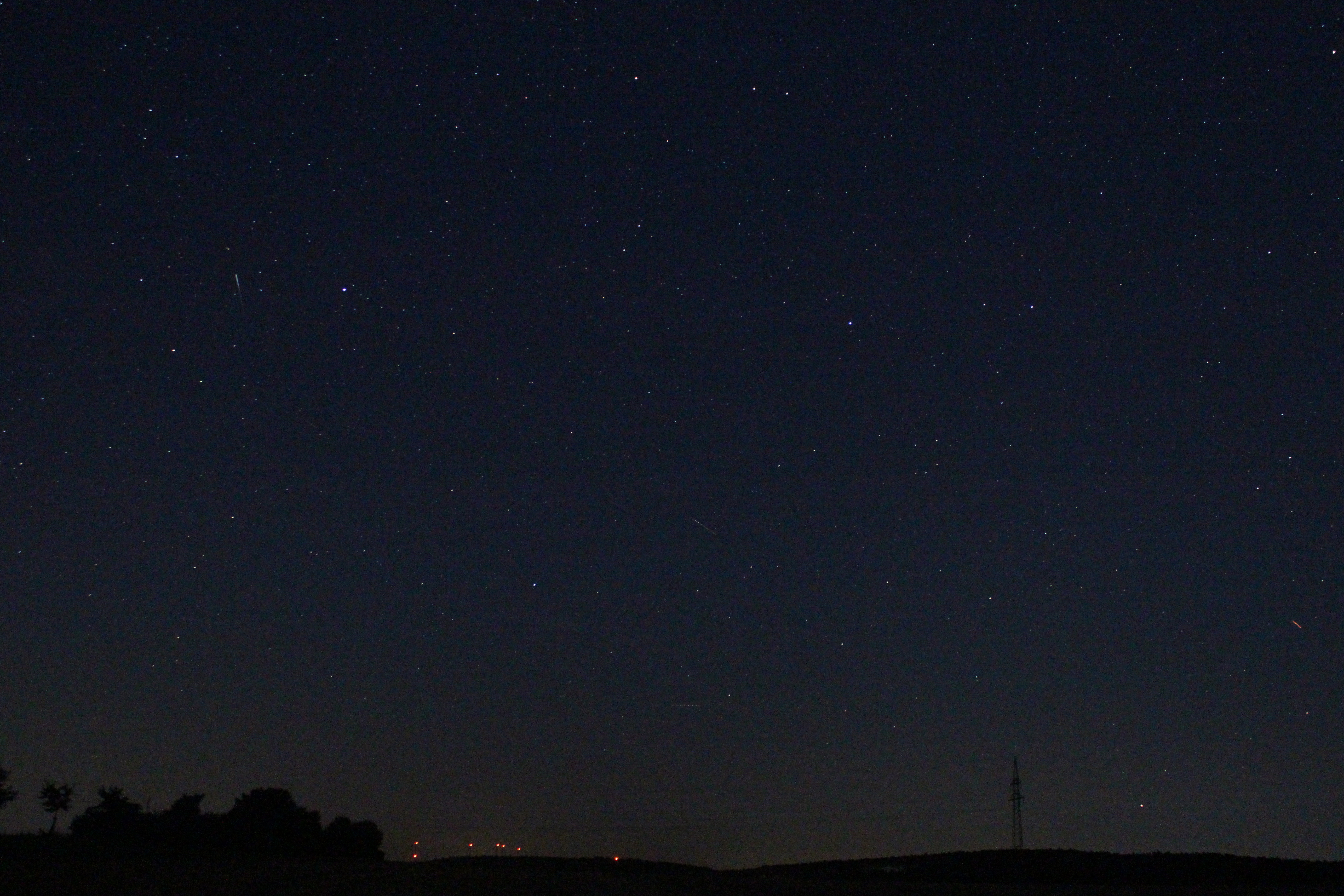 Das Herbstviereck – gebildet aus drei Sternen des Pegasus (Algenib, Markab und Scheat) und einen Stern der Andromeda (Sirrah) - über dem Osthorizont, aufgenommen westlich von Wollbach. In dieser Position erinnert es an ein Vorfahrtstraßenschild.