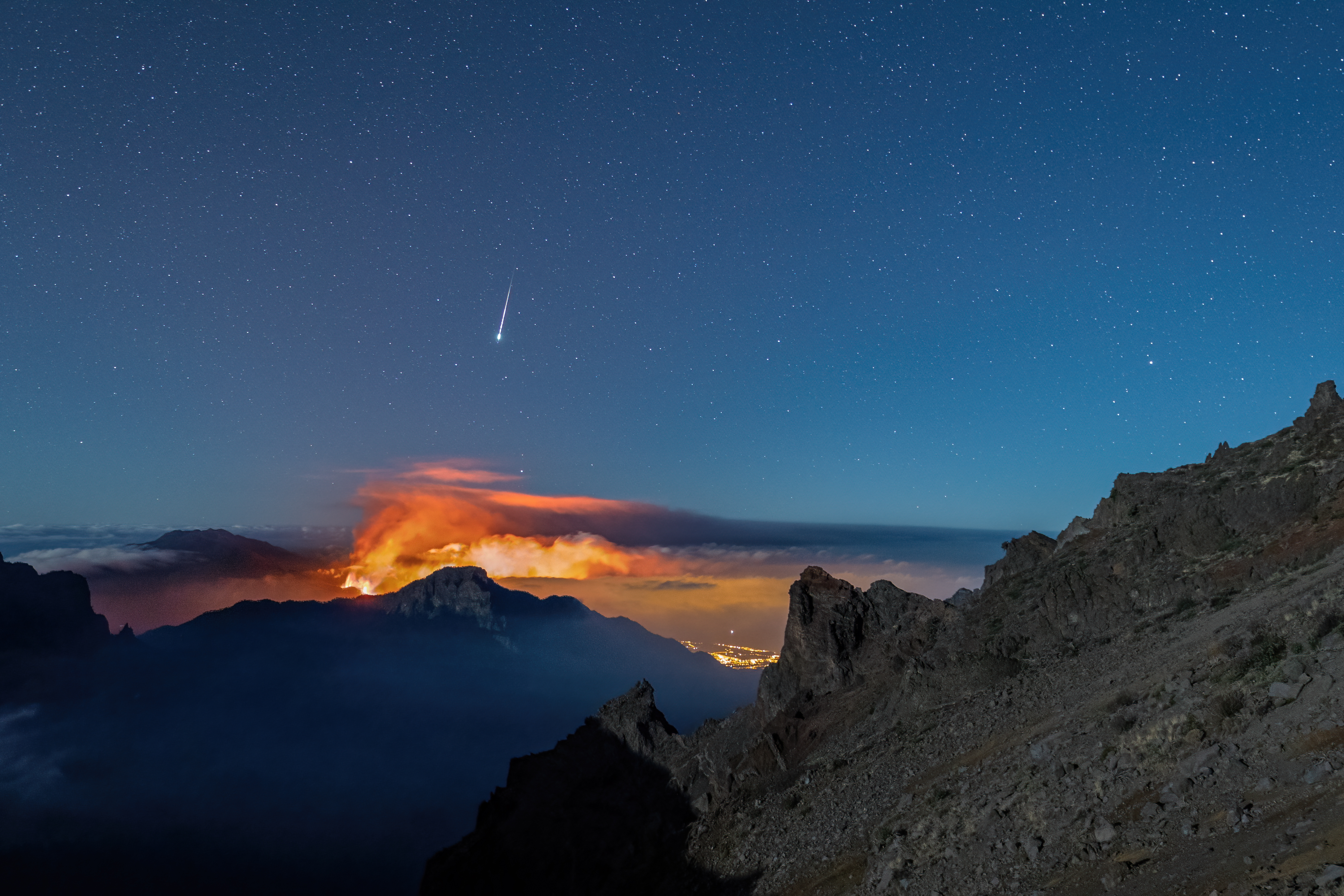 Bei einem Kurztrip nach La Palma habe ich auf dem Berg Roque de los Muchachos den zur Zeit aktiven Vulkan der Vulkankette Cumbre Vieja im Sternenlicht fotografiert. Der ohnehin wunderschöne Anblick wurde zu einem unvergesslichen Moment, als gegen 03:30 Uhr MESZ ene helle Sternschnuppe den Himmel erleuchtete.
