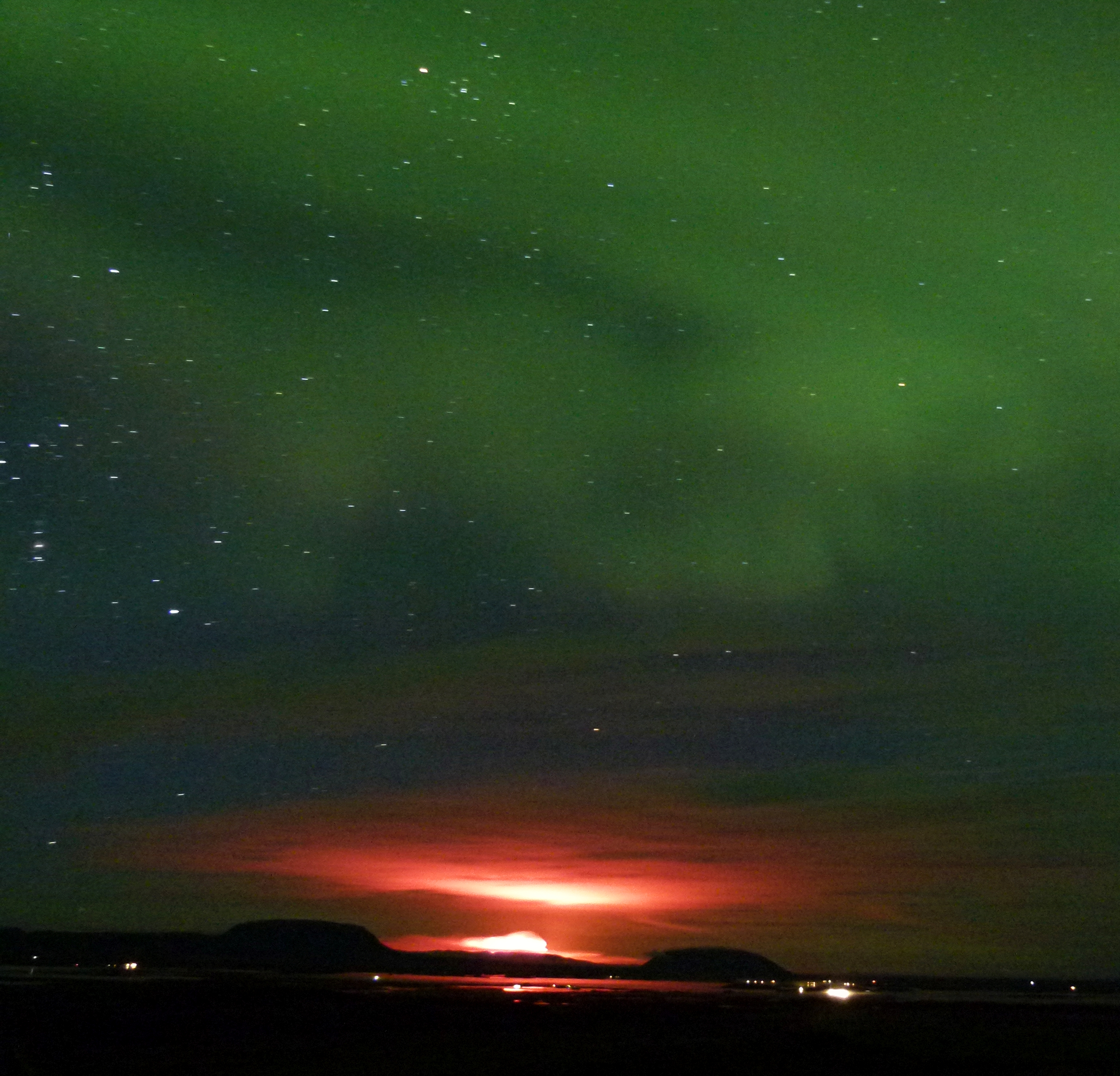 Ein dramatisches Naturschauspiel entfaltete sich vor meinen Augen auf Island in der Nacht des 24. September 2014: Eine Spalte des aktiven Vulkans Bardarbunga hatte sich geöffnet und spie rotglühende Lava in den Nachthimmel, während darüber Polarlichter in Girlanden und Bändern tanzten. Der Feuerschein der Lavafontänen wurde von der Eruptionswolke reflektiert und spiegelte sich im davor liegenden Mückensee. Schon am Vortag erreichte eine toxische Schwefeldioxidwolke aus der Eruptionsspalte einige Ansiedlungen, deren Lichter am Ufer des Sees zu sehen sind. Links am Rand dieser Kurzstrichspur-Aufnahme ist ein Teil des Sternbildes Orion mit den 3 Gürtelsternen und dem Orion-Nebel zu sehen, am oberen Bildrand leuchtet Aldebaran mit den Hyaden und rechts schimmert der Kopf des Walfisches durch das Polarlicht hindurch.
