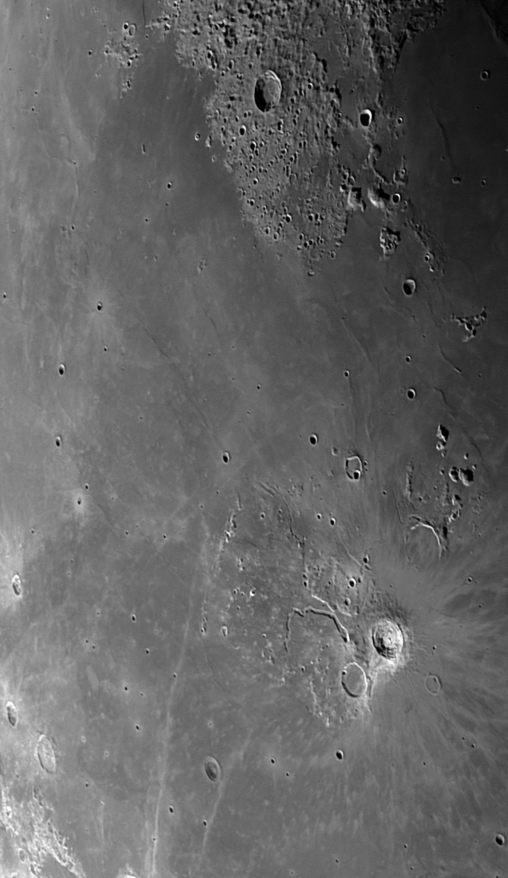 Eine Fülle von vulkanischen Erscheinungen zeigen sich in der Nähe des hellen Kraters Aristarch. Das Plateau, das Aristarch trägt, ist vulkanischen Ursprungs. Ebenso das Schrötertal. Mons Rümker ist der größte vulkanische Dom. Er ist durch die senkrechte Beleuchtung kaum sichtbar am linken Bildrand (obere Bildhälfte). Die Montes Gruithuisen Gamma und Delta sind 1800 resp. 2000 m hoch und damit die höchsten lunaren Dome.