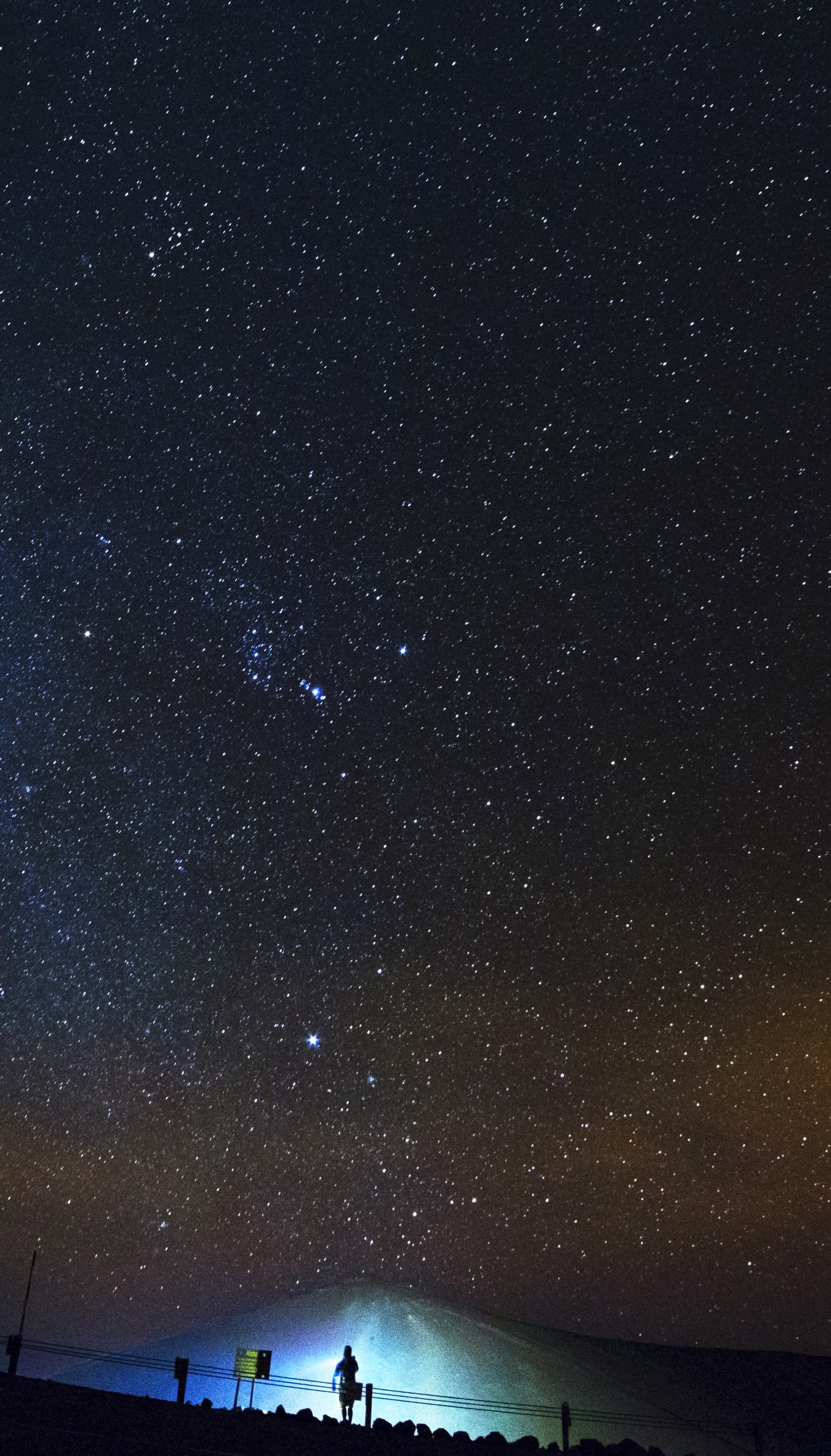 Eine meiner Belichtungen auf dem Mauna Kea zeigte eine Überraschung. Nach fünfstündiger Wanderung vom Visitor Center zum Gipfel trat der Wanderer zufällig in mein Foto und beleuchtete den tatsächlichen Gipfel des Mauna Kea mit seinem Smartphone. An dieser Stelle erreicht der Mauna Kea eine Höhe von 4205 Meter. Über diesem "Highway to Heaven" sind Großer Hund mit Sirius, Hase, Orion und die Hyaden zu sehen.