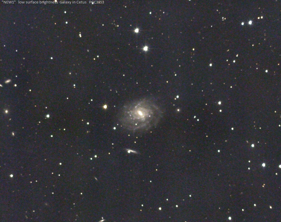 New1, auch PGC 3853, ist eine Kreation von Harlow Shapley, es gibt auch New2 bis New6. Bei der Erstellung des Shapley-Ames-Katalogs wurden diese 6 Objekte gefunden. New 1 ist eine relativ helle (11,6 mag, Typ SAB(rs)d, 4,4 x 3,3 Bogenminuten) Spiralgalaxie im westlichen Walfisch. Ihre Entfernung beträgt 41 Millionen Lichtjahre. Durch die weitgeöffneten Arme (Face-on) ist die Flächenhelligkeit allerdings gering (14,2 mag pro Quadrtatbogensekunde), so dass visuell nur der kleine Zentralbereich sichtbar ist. Deshalb musste ich auch 9h 40min daraufhalten, um sie einigermaßen sichtbar zu machen. Ein schönes Projekt!
