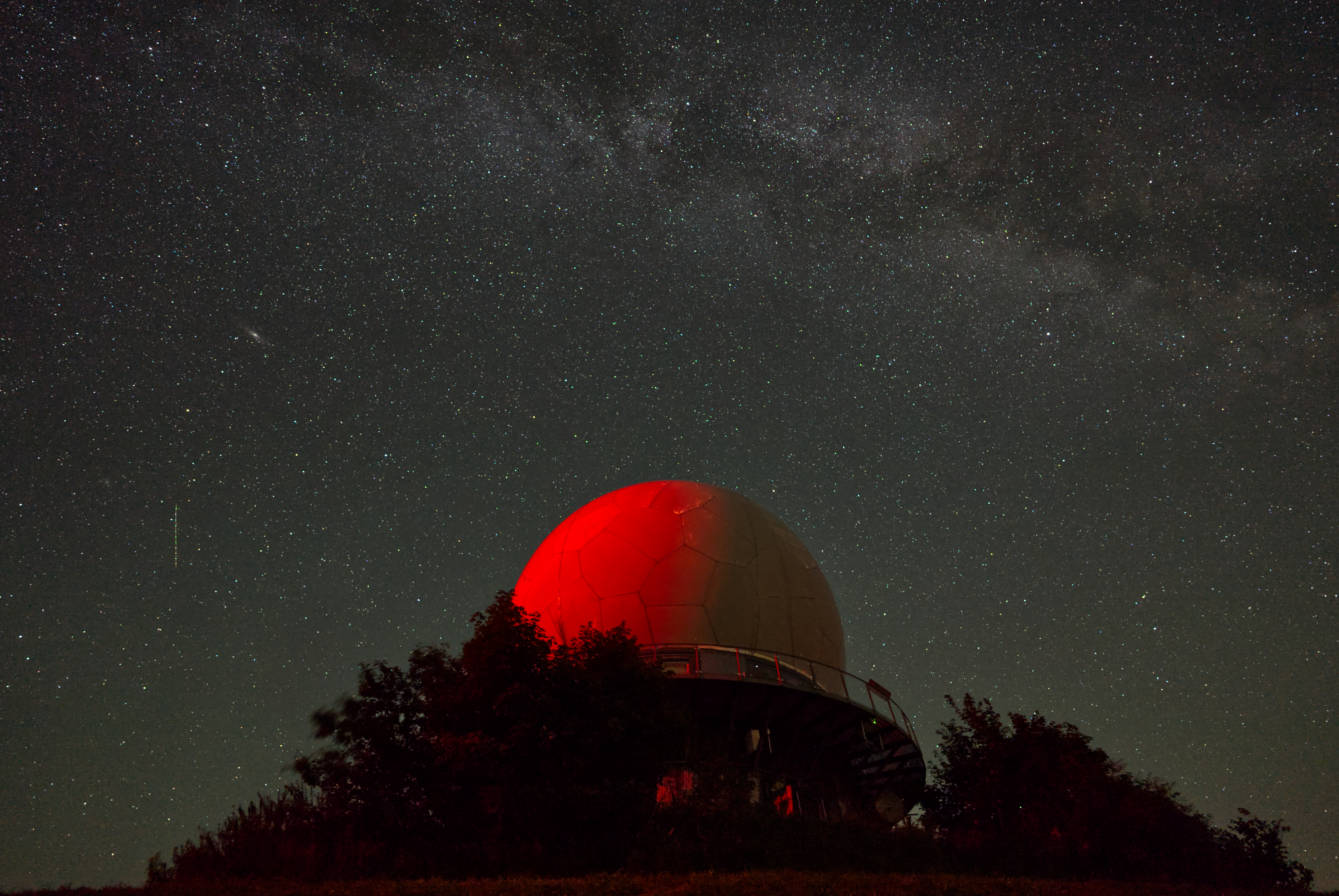Das angeleuchtete Radom auf der Wasserkuppe im Sternenpark Rhön mit Andromeda und Milchstraße sah sehr mystisch aus. (Das rote Licht wird durch die Senderleuchte erzeugt.)