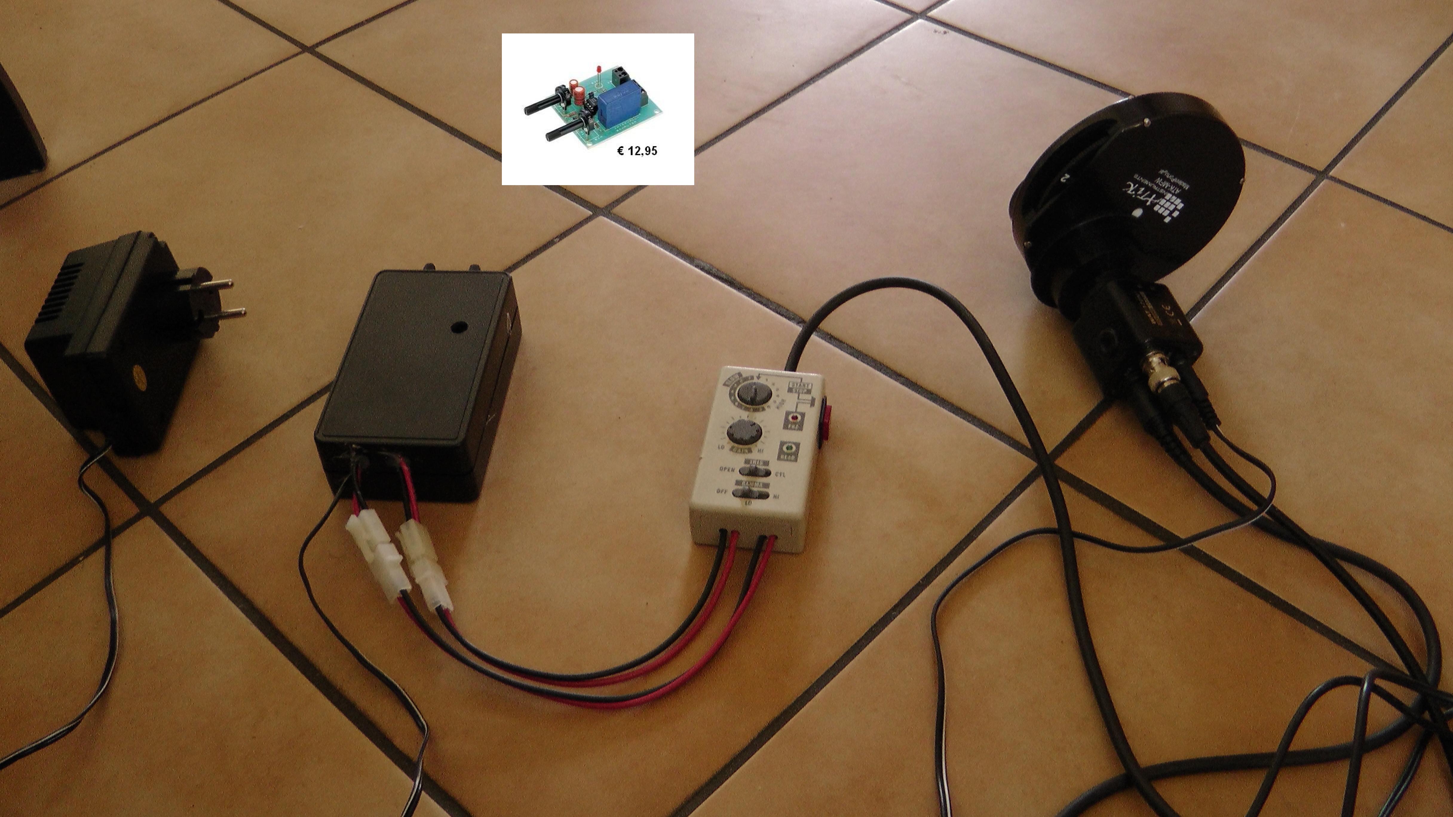 Automatisch belichtet die Watec 120 N+ maximal 10,24 Sekunden. Die hohe Lichtempfindlichkeit der Watec lässt es trotzdem zu, schwache Objekte wie Nebel und Galaxien abzubilden. Doch die fotografische Ausbeute kann erhöht werden. Die Watec 120 N+ hat für längere Belichtungszeiten einen Handauslöser, was bei Belichtungsserien unbequem ist, vor allem, wenn man in der Kälte steht. Durch einen kleinen Umbau, die Überbrückung des Handschalters durch einen 12,45 € billigen Intervallschalter (Bausatz) habe ich den Einsatzbereich meiner Watec deutlich steigern können. Das Bild zeigt die Kamera nach dem Umbau.