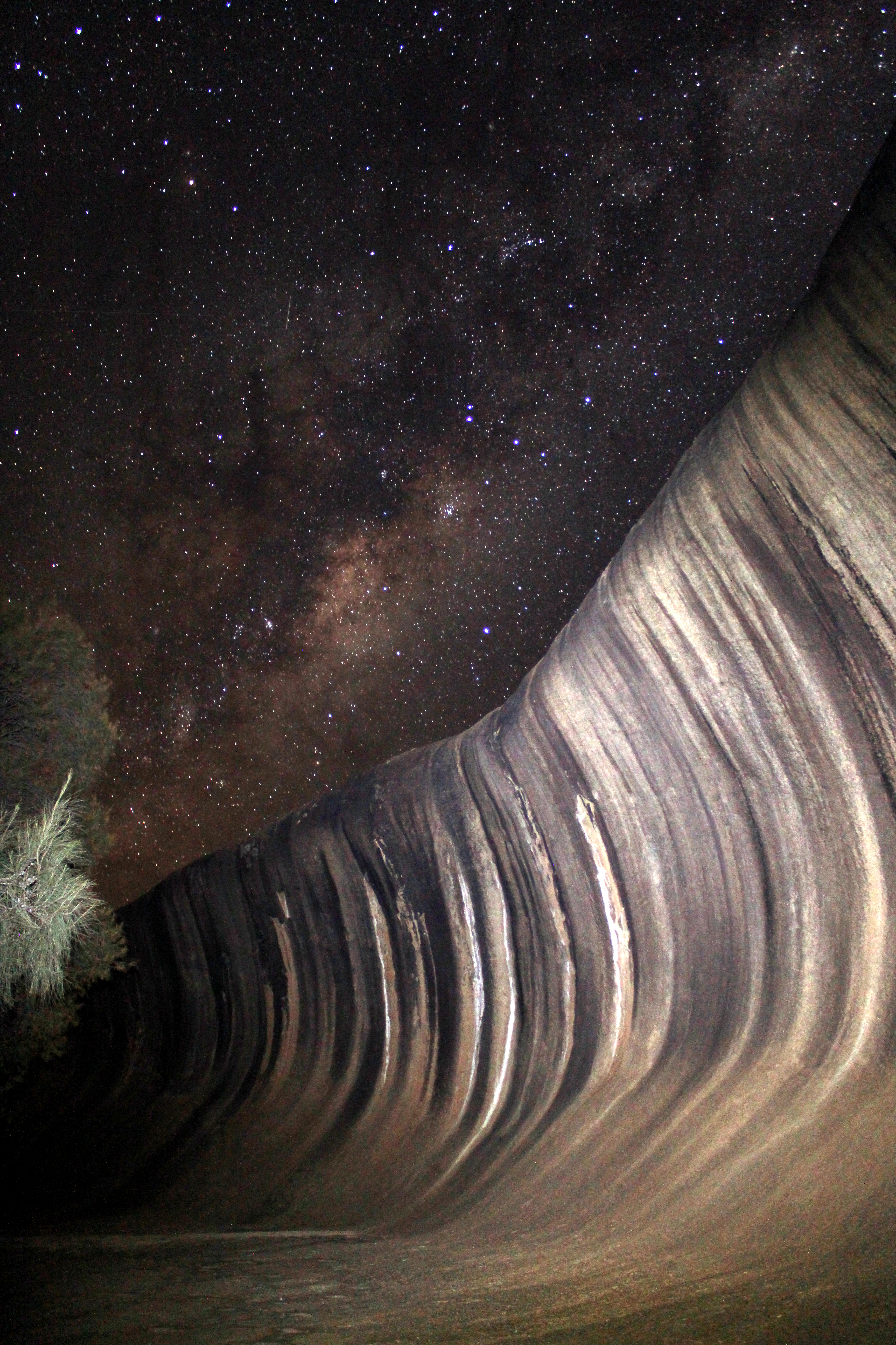 Etwa 300 km östlich von Perth (Australien) liegt das 300-Seelen-Dorf Hyden. In der Nähe befindet sich die gut 2.5 Milliarden Jahre alte Gesteinsformation "Wave Rock". Seinen Namen hat der 15 m hohe und mehr als 100 m lange Wave Rock seiner Form zu verdanken, welche einer sich brechenden Welle ähnelt. Auf Grund der Abgeschiedenheit ließ sich die Milchstraße ohne nennenswerte Lichtverschmutzung fotografieren. Die Beleuchtung des Wave Rock erfolgte eigenständig, da dieser nachts nicht künstlich beleuchtet wird.