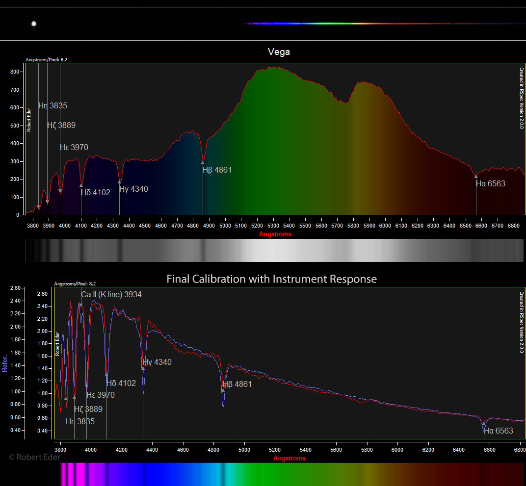 Das ist das Spektrum vom Stern Wega im Sternbild Leier. Man kann hier die kompletten Linien der Wasserstoff-Balmer-Serie sehen. Diese beschreiben die Spektrallinien des Wasserstoffatoms und sind in einem Klasse-A-Stern wie Wega sehr prominent. Ich habe den UV/IR-Sperrfilter von der Kamera entfernt, um auch die Linien unter 400nm zu sehen, da sie bereits im ultravioletten Bereich liegen. Das obere Profil stammt von der Kamera, kalibriert auf die richtigen Wellenlängen. Aber der Sensor hat nicht die gleiche Empfindlichkeit gegenüber allen Wellenlängen. Darum muss man eine »Instrument Response« erstellen, um die Kurve zu korrigieren. Das dauert einige Zeit, aber man braucht es für sein Setup nur einmal machen. Unten ist die korrigierte Kurve eingerechnet und man erhält ein perfektes Profil des Objekts. Die rote Linie ist das von mir erstellte Profil und die blaue Linie ist die Referenz aus einer professionellen Datenbank. Da bin ich ziemlich nah dran!