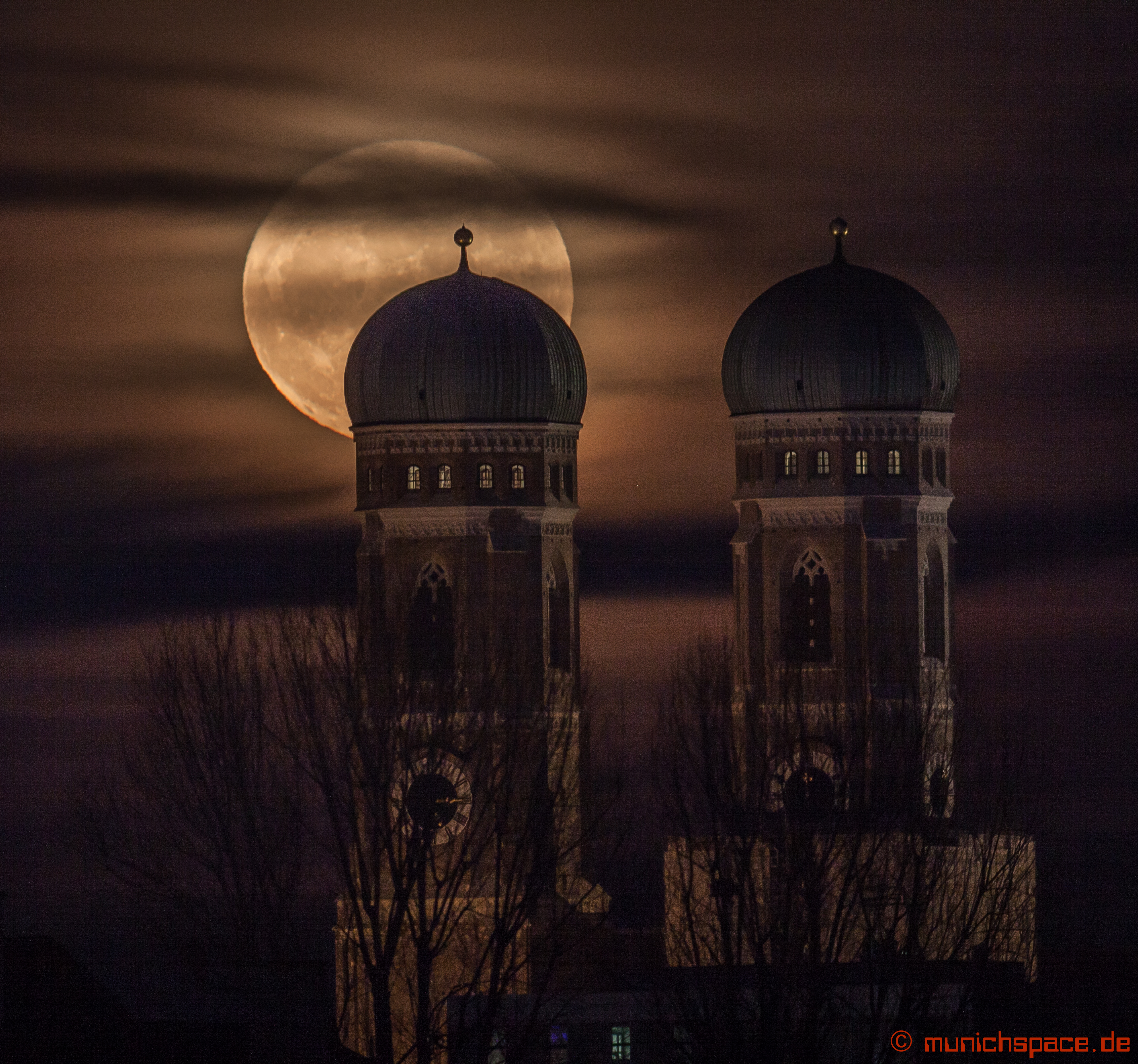 Etwa 5 Stunden nach Vollmond ist am 25.12.2015 um kurz nach 17:00 Uhr der Mond über München aufgegangen. Diese Fotos wurden am Fuße der Bavaria (Theresienhöhe) aufgenommen. Der Mond war zu diesem Zeitpunkt etwa 381 000 km von der Erde entfernt.