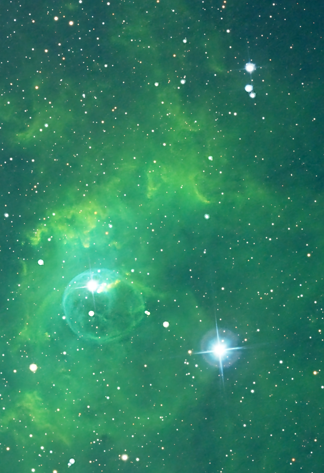 Hoch oben am winterlichen Nachthimmel, im Sternbild Kassiopeia, leuchtet eine ganz besondere Weihnachtskugel: der Blasennebel. In seinem Inneren lebt links oberhalb der Mitte der mächtige O-Stern BD+60°2522 der mit seinen Winden die Kugel formte. Seitdem erzählt man sich, dass der Blasennebel jedes Jahr am 1. Advent besonders hell strahlt, als ob er die Sterne und die Erde daran erinnern möchte, wie schön und grenzenlos die Wunder des Himmels sind.