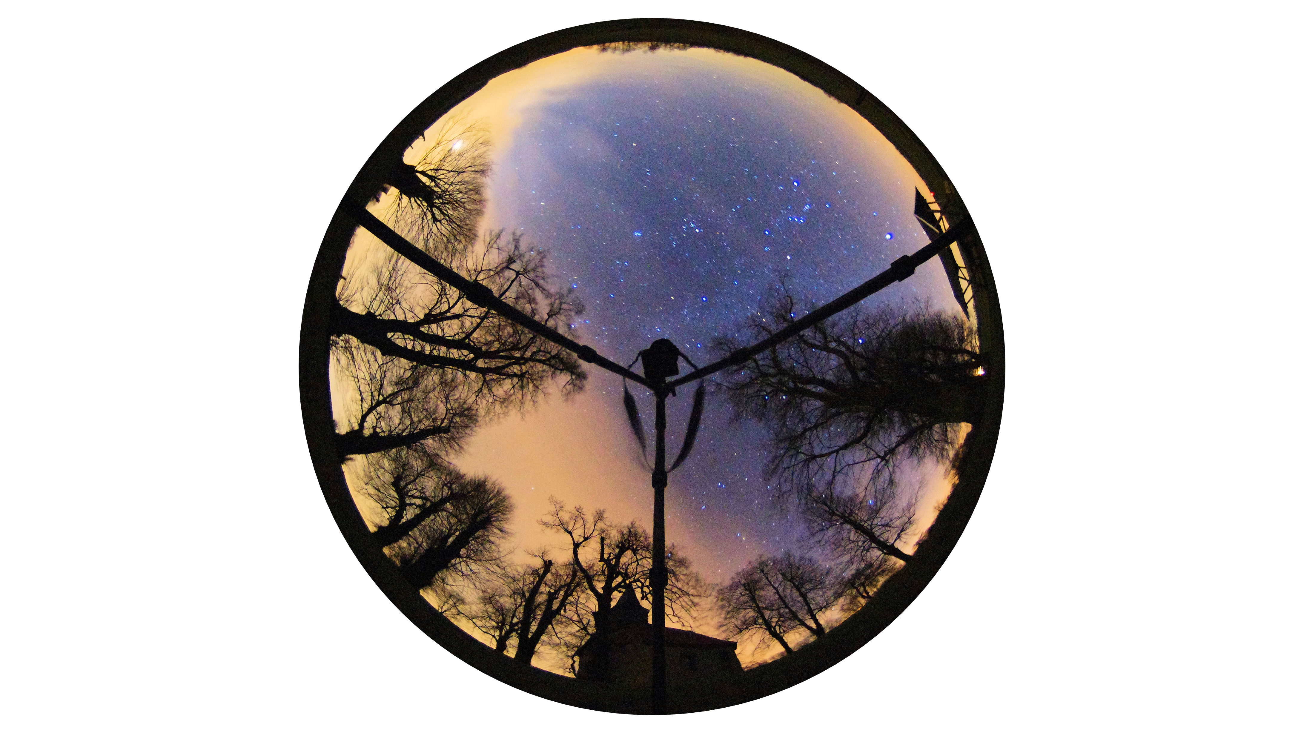 Aufgenommen am Abend des 7.2.2011. Diese Aufnahme ist mit Hilfe eines Halbkugelspiegels (Durchmesser 60 cm) entstanden, über dem eine normale Kamera mit Stativ aufgestellt war. Durch diese Konstruktion ist es möglich, den gesamten gerade sichtbaren Himmel aufzunehmen. Die eigentliche Kamera samt Stativ ist dadurch mit auf dem Foto zu sehen. Links oben scheint durch die Wolken und Baumäste der untergehende Mond.