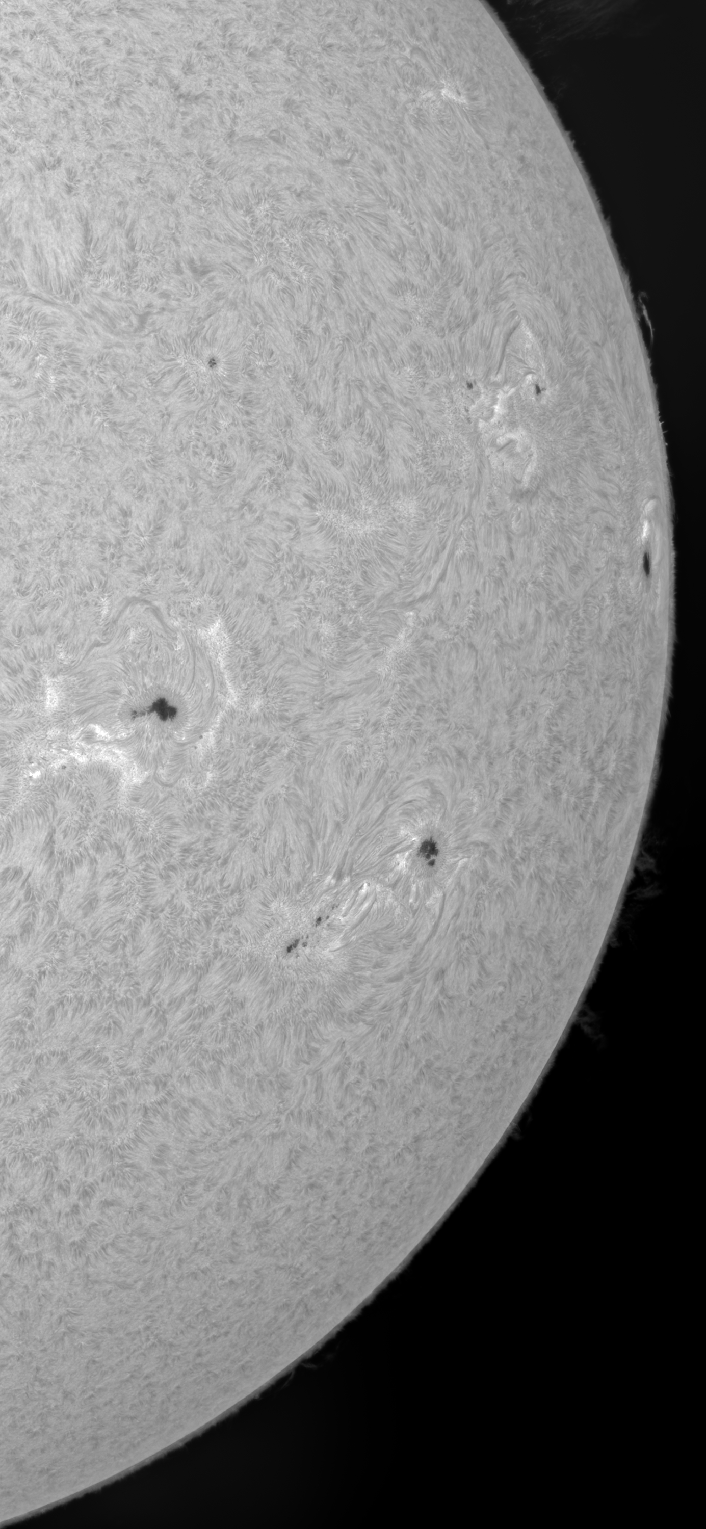Panorama aus sechs Einzelbildern - Kein Komposit, also Einzelbild inklusive Protuberanzen am Rand vom Westteil der Sonne am 28. August mit all den abwandernden, großen Fleckengruppen.