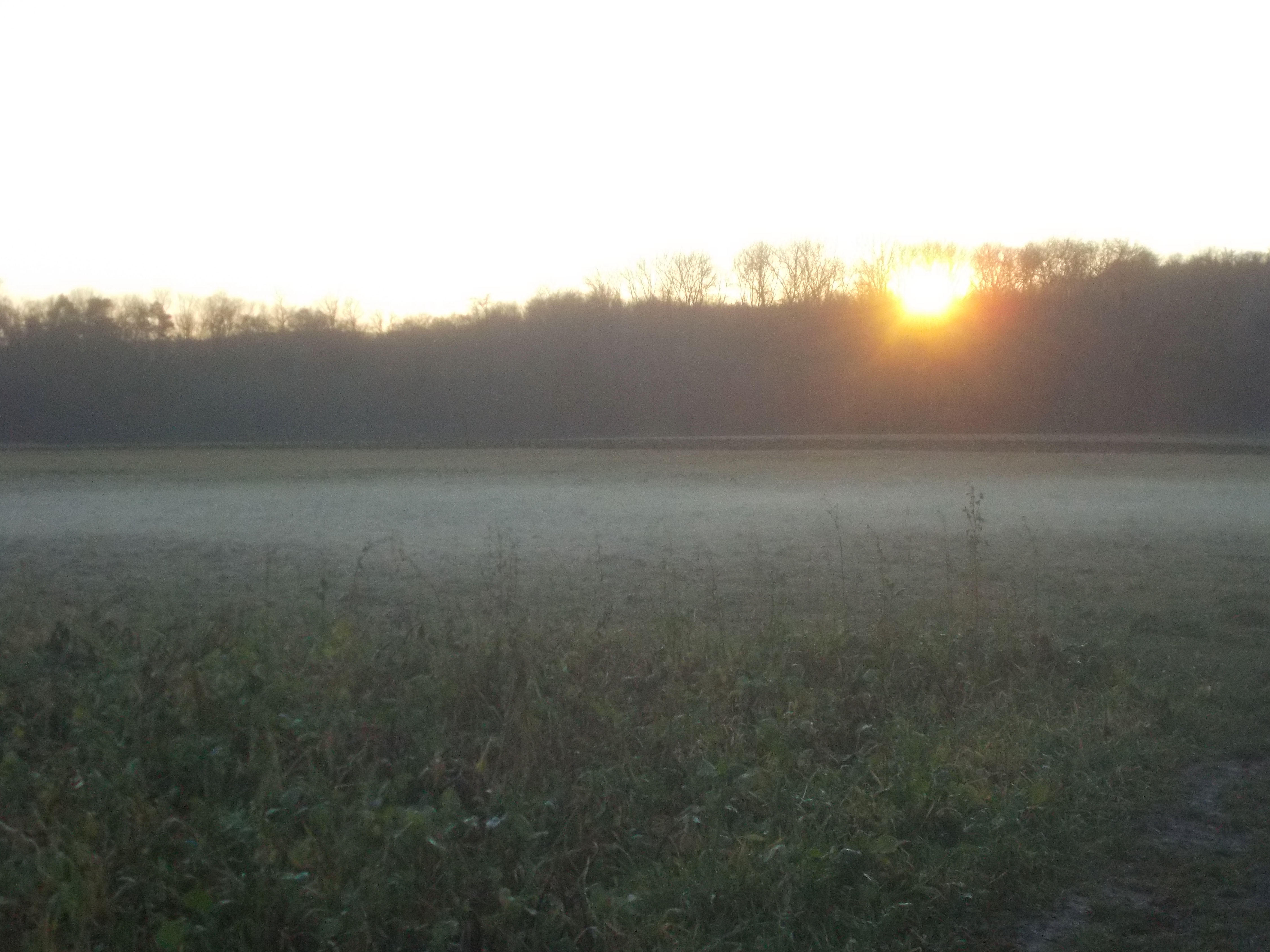 Tiefstehende Sonne mit Bodennebel im Vordergrund. Zu letzteren könnte auch der Minuten zuvor erfolgte Start eines Raketenmodells beigetragen haben.
