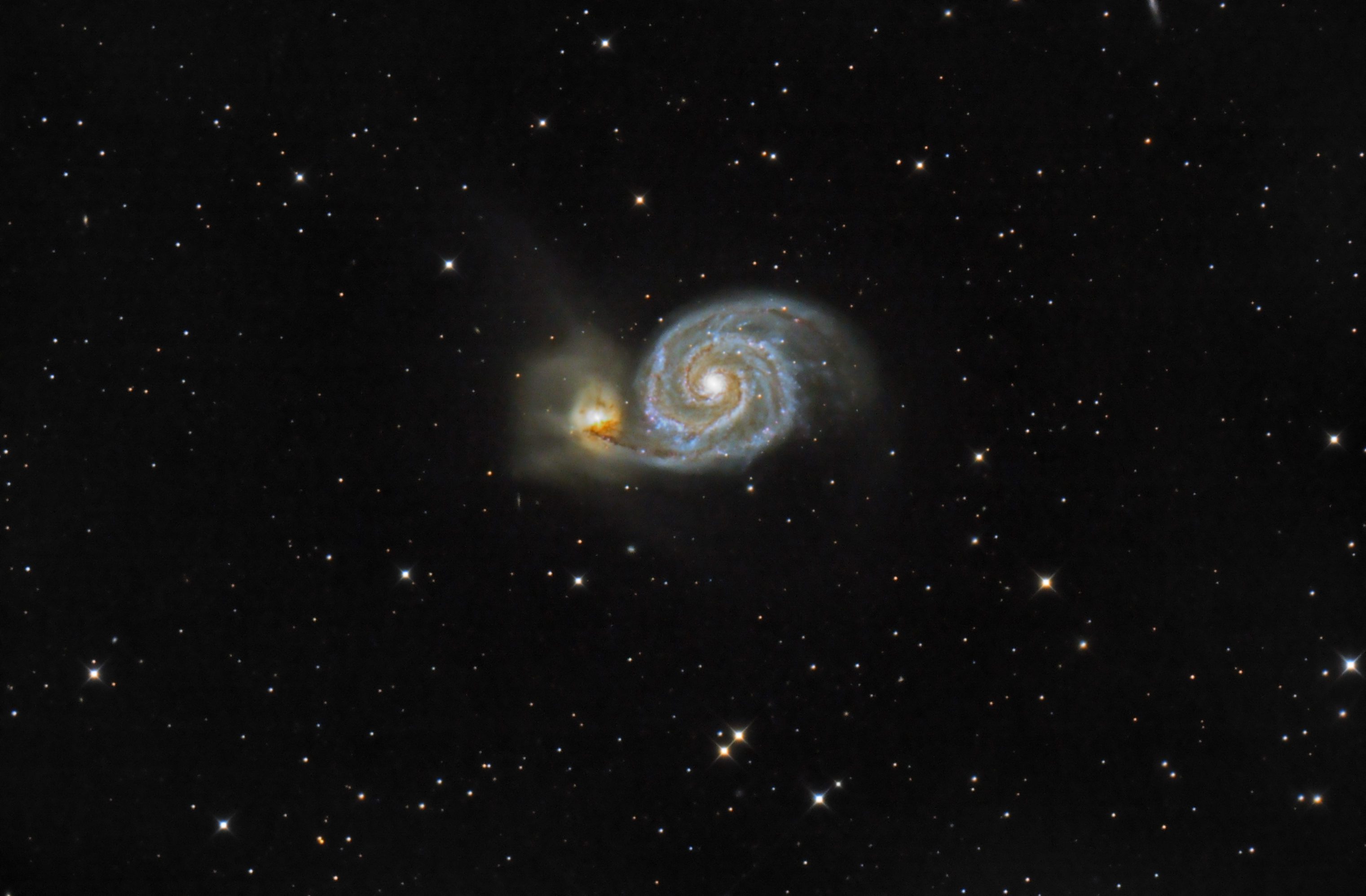 Der Klassiker M51, die Spiralgalaxie schlechthin konnte ich nach einigen Jahren mal wieder ins Visier nehmen! Die Entfernungsangabe schwanken sehr stark von 20 bis 35 Miliionen Lichtjahren. Mal sehen, was die Zukunft noch für Messergebnisse bringt!