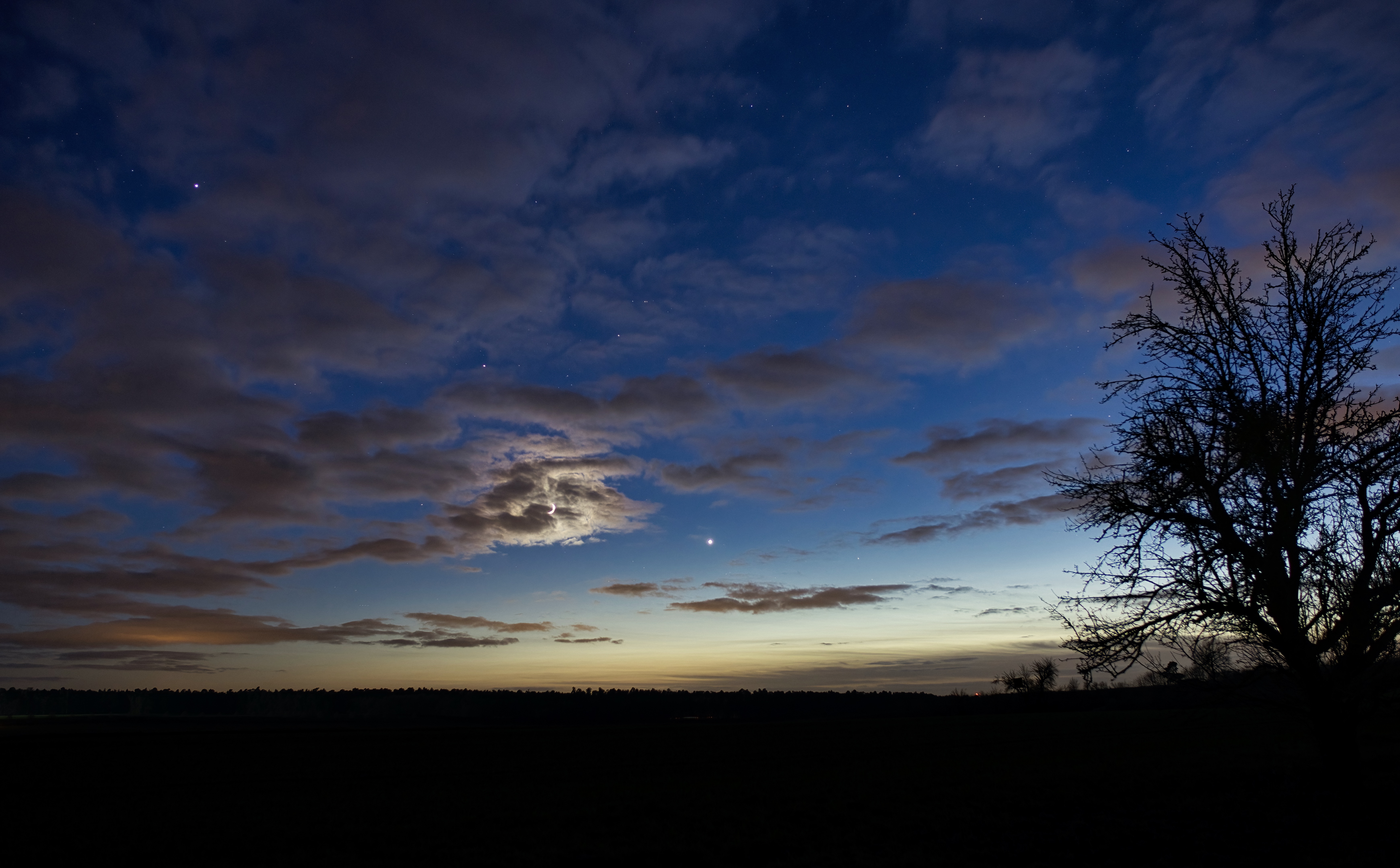 Jupiter, Saturn, Venus und die Mondsichel versteckt sich hinter lockeren Wolken.