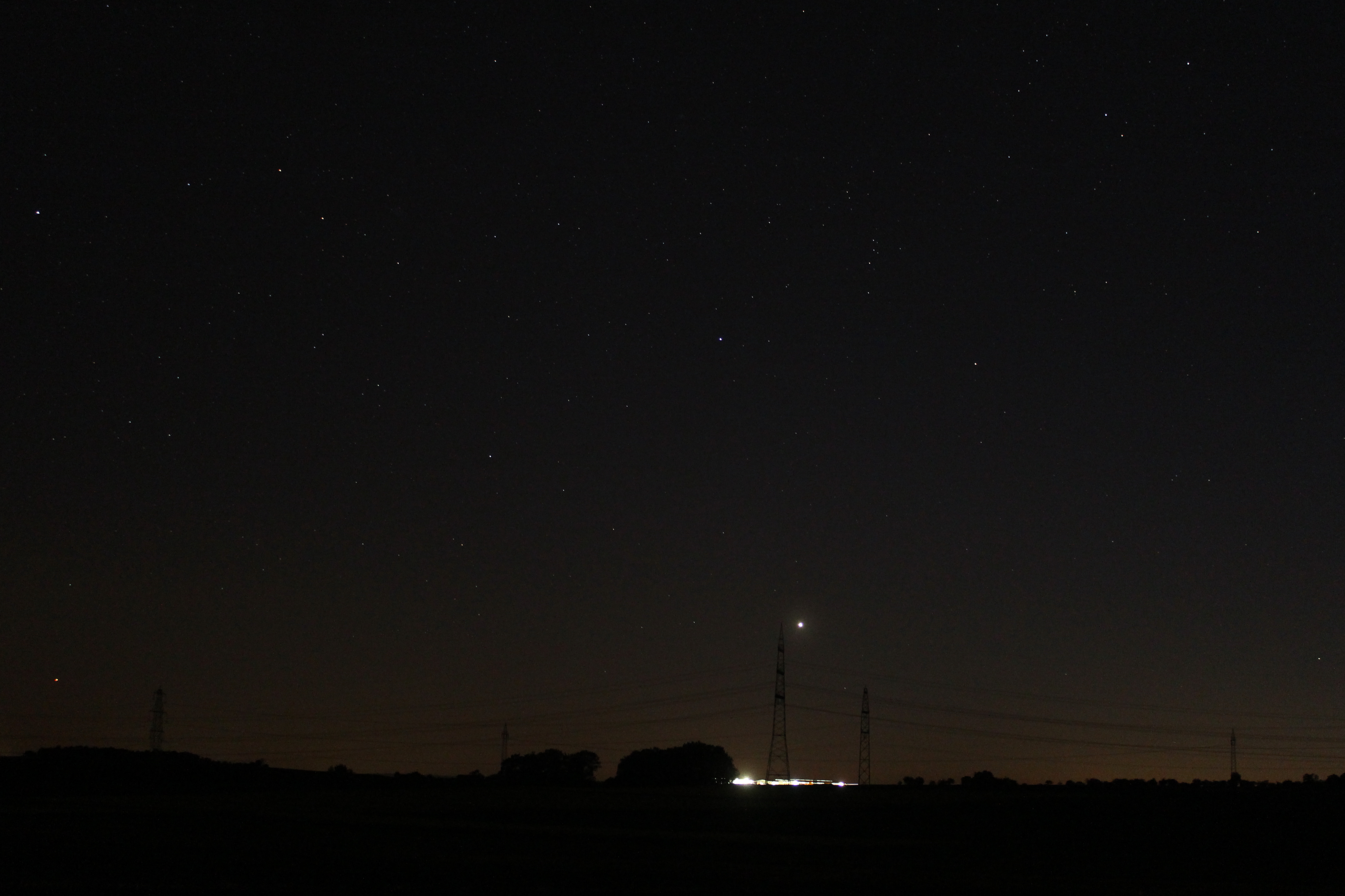 Venus am Abendhimmel im untergehenden Sternbild Stier. Am linken Bildrand erkennt man in gleicher Höhe Beteigeuze - den letzten hellen Stern vom Orion.