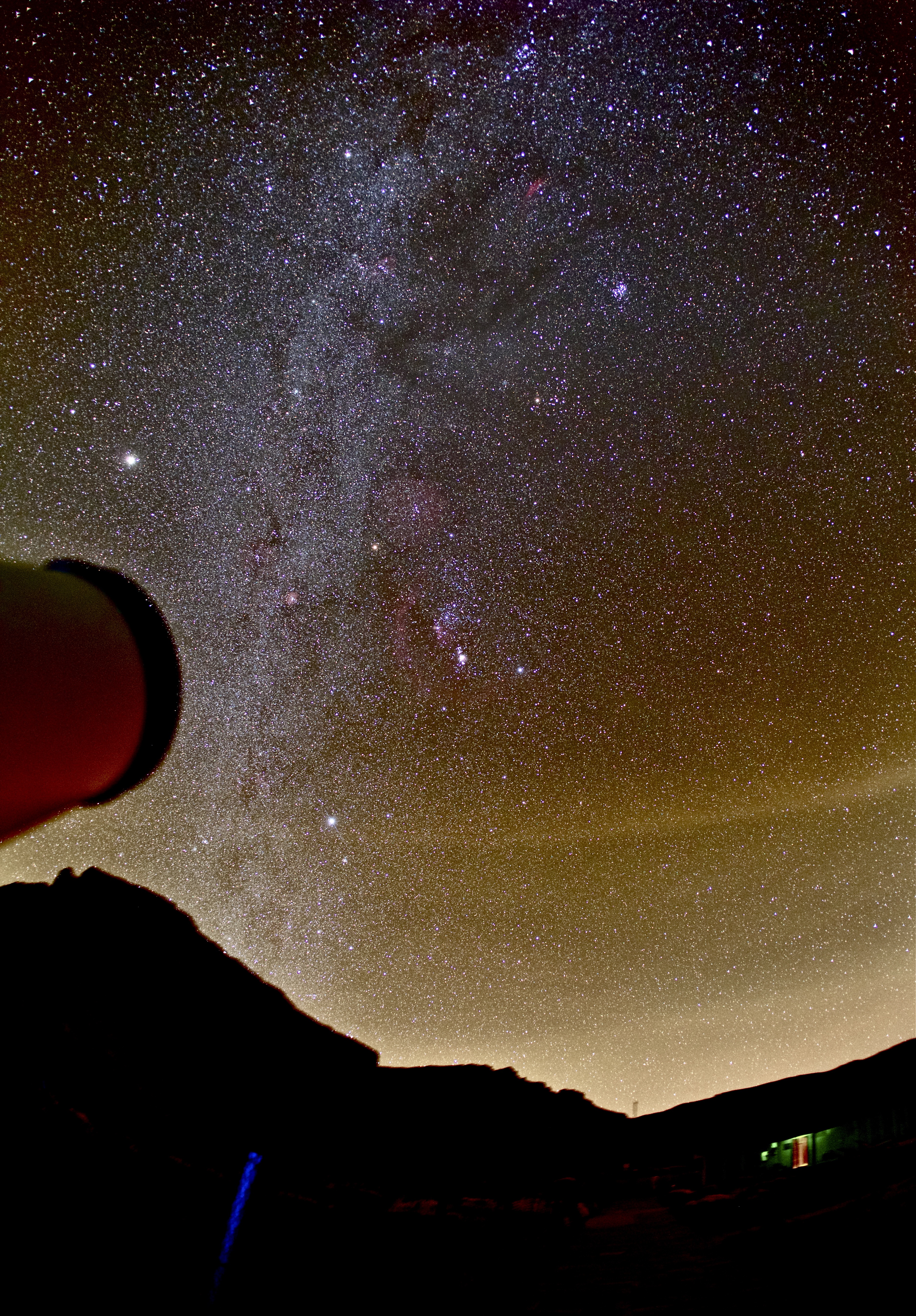 In der Hochebene der Canadas von Teneriffa gibt es nur ein einziges Hotel, das Parador. Der Ort ist ein Refugium für Astrofotografen. Nicht weit entfernt befinden sich die Profi-Observatorien des IAC, allerdings vorwiegend die Tagbeobachtung. Trotz Lichtschutzverordnung ist der Himmel Richtung Süden inzwischen deutlich aufgehellt. Markant ist die Farbe der vorgeschriebenen Natrium-Dampf-Lampen - sie dominieren den Himmelshintergrund, lassen sich zum Glück einigermaßen ausfiltern. Auf dem Roque / La Palma, wo vor allem Nachbeobachtung mit großen Teleskopen betrieben wird, ist die Situation noch leicht besser, aber man kann hier zusehen wie einer der besten Beobachtungsplätze der nördlichen Hemisphäre an Qualität verliert. Licht - wann immer man es benötigen könnte auch zu haben, ist für die meisten Menschen ein Stück Lebensqualität. Genau so wie kein Licht für die Astronomie-Begeisterten ein Stück Lebensqualität darstellt.