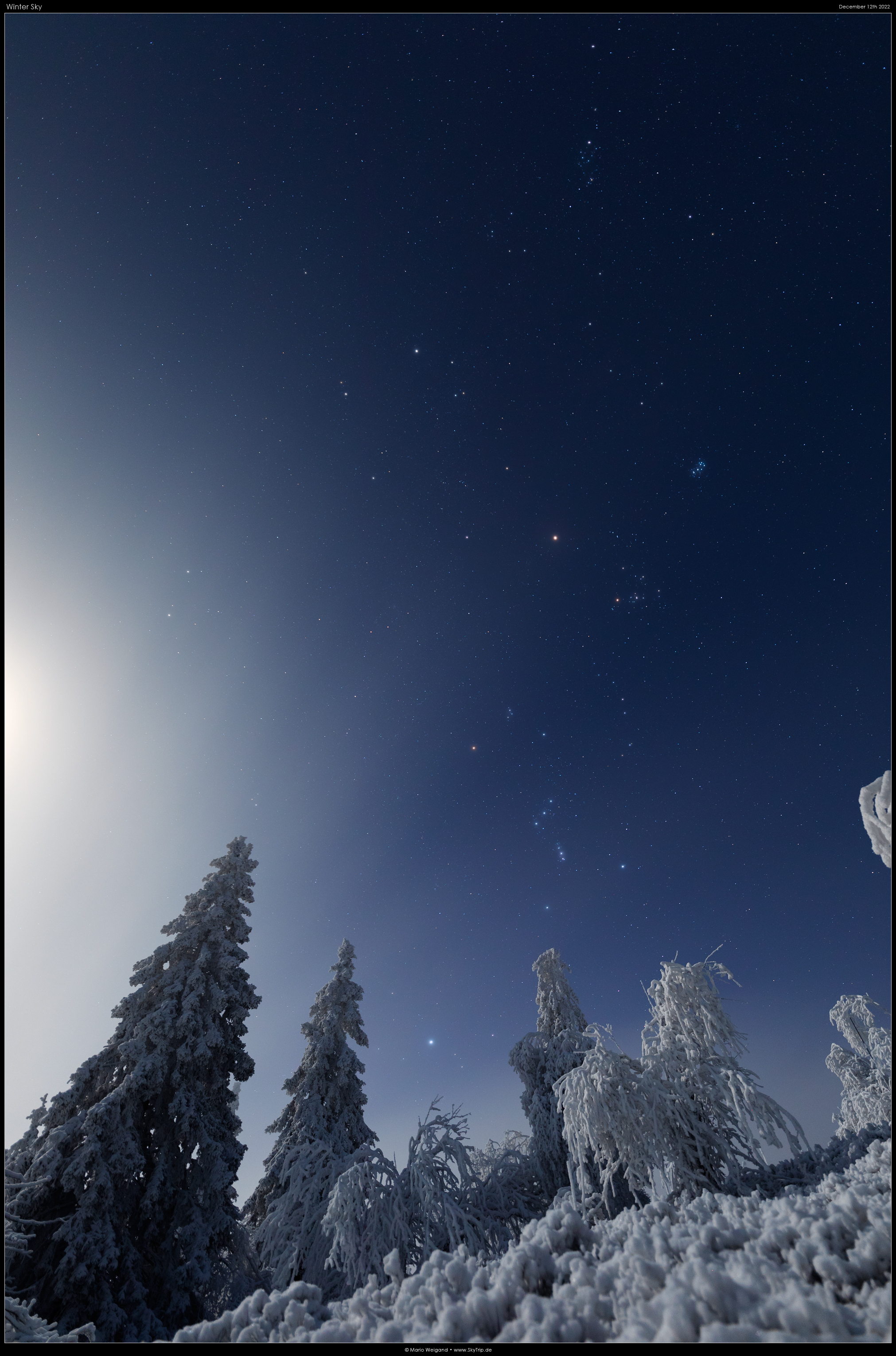 Im Dezember 2022 hat sich der Taunus in eine tolle Winterlandschaft verwandelt. Bei Mondlicht ergeben sich gute Gelegenheiten, diese zusammen mit dem Sternhimmel in Szene zusetzen. Hier sind die Highlights des Winterhimmels zu sehen, zusammen mit Mars im Sternbild Stier. Immer wieder zog Nebel durch, teilweise wartete ich zehn Minuten zwischen halbwegs klaren Minuten. http://www.skytrip.de