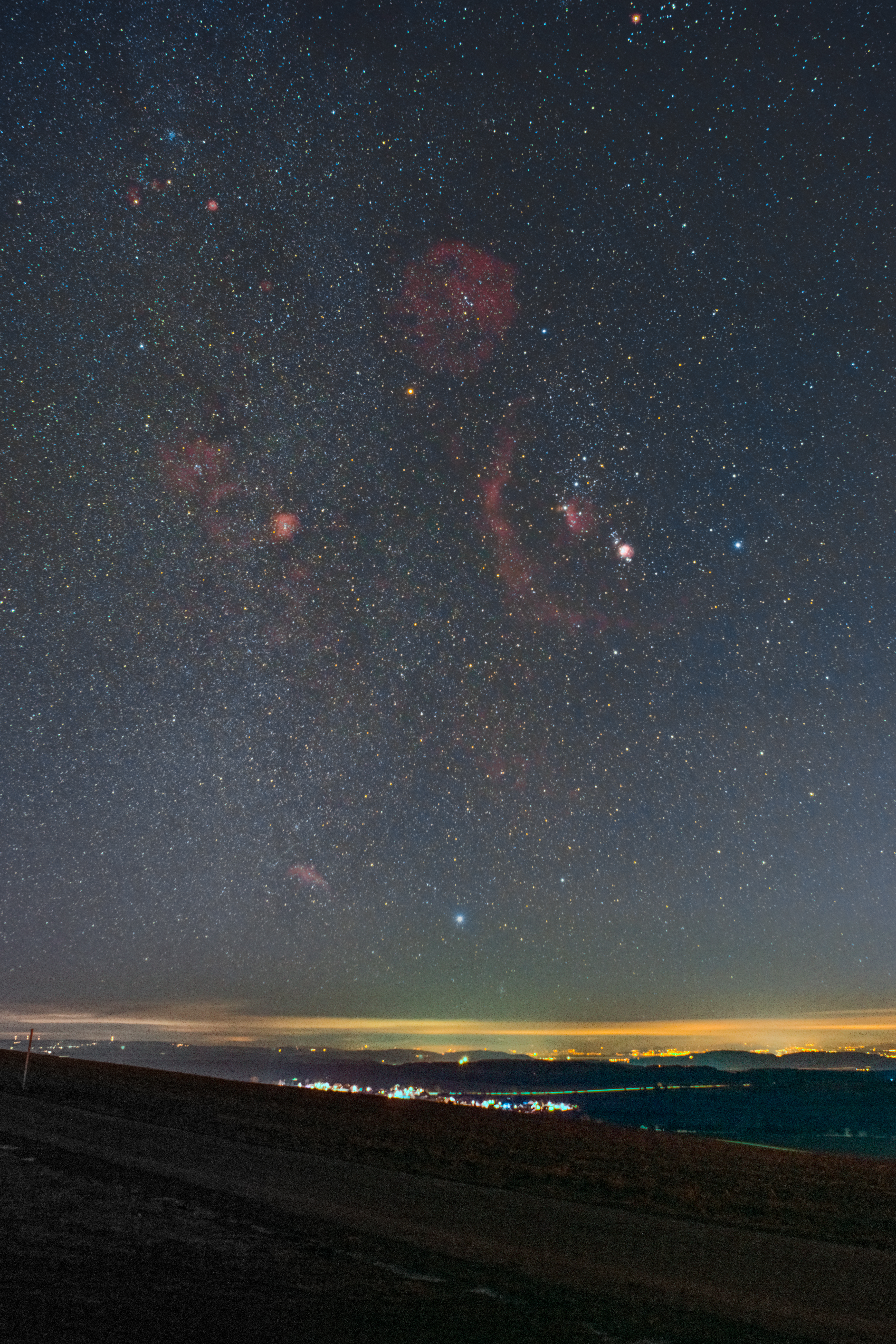 Der Winterhimmel vom Gipfel des Witthohs aus fotografiert. Zu sehen sind mehrere rote Emissionsnebel entlang der Milchstraße in der Umgebung vom Sternbild Orion.