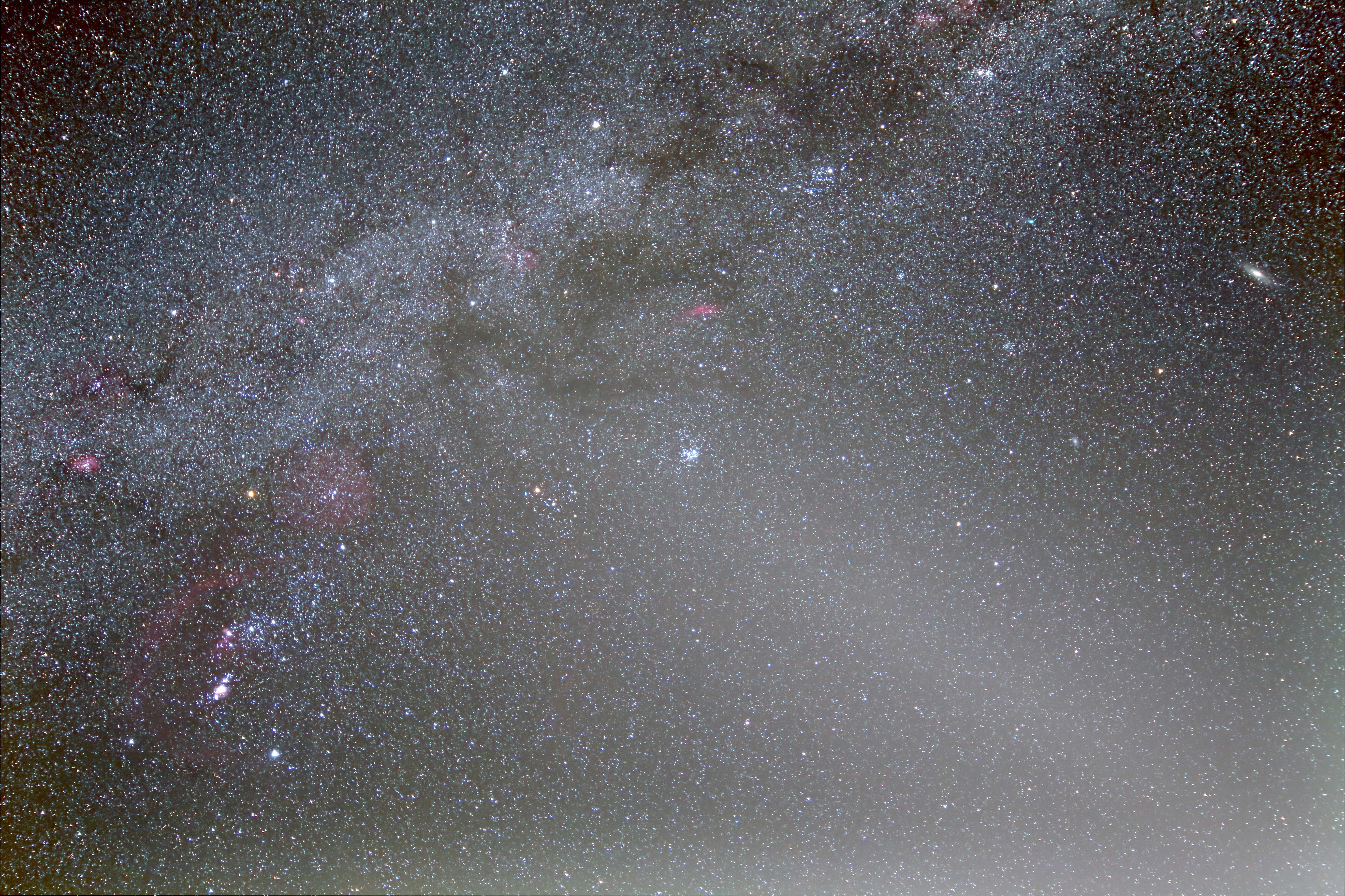 Objekte von links nach rechts: Rosetten-Nebel, Barnards-Schleife, Lampda-Orion-Ring, Hyaden, Plejaden, California-Nebel, Doppelsternhaufen im Perseus, Komet Lovejoy (oberhalb des Sterns Alamak), schließlich die Galaxien Messier 33 und Messier 31. Aufhellung von der rechten unteren Bildecke in Richtung Bildmitte: Ende des Zodiakallichts (war freiäugig gut zu sehen).