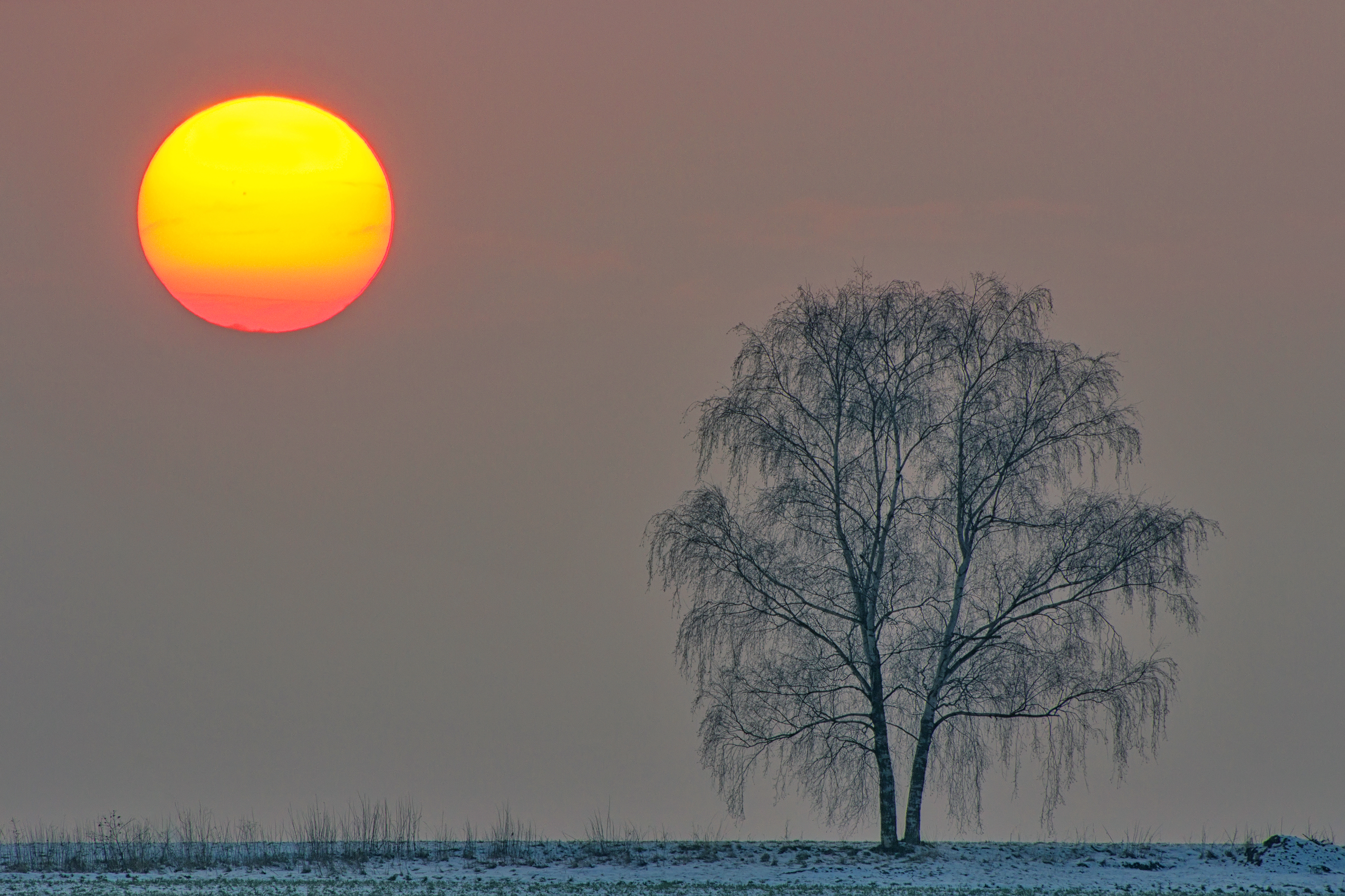 Nach über drei Jahren ist mir endlich dieses Foto gelungen. Die Wetterbedingungen am 9. Februar 2018 waren endlich perfekt. Aus rund 1,5 km Entfernung und diesiger Sicht konnte ich die Sonne ohne Filter bei knapp 500 mm Brennweite neben der Birke ablichten.