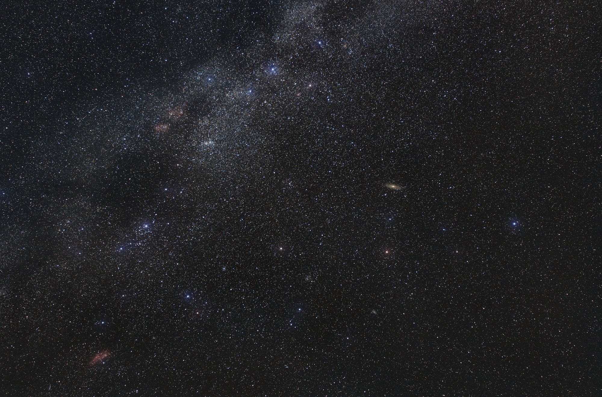 Sternbilder Andromeda, Perseus und Kassiopeia; aufgenommen mit einem 17-mm-Weitwinkelobjektiv (25 x 2 min; Bl. 5.0; ISO 1600) und Nachführung über die Star Adventurer. Dieses Bild wurde von meinem Garten aus aufgenommen. Leider ist durch die Himmelsaufhellung (Industriezone, beleuchtete öffentliche Gebäude) die Milchstraße kaum zu sehen. Längere Belichtungszeiten und Bildverarbeitung können auch nur begrentzt helfen.