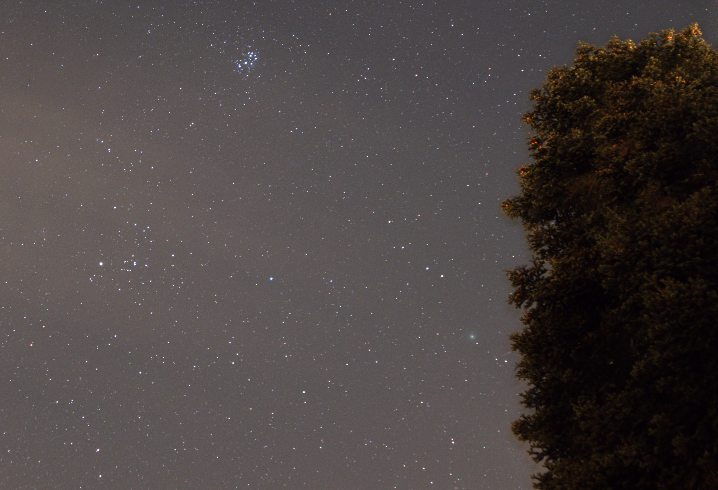 Gerademal zehn Minuten Zeit blieben gestern Abend für meine erste Belichtung des Kometen 46P, dann war der Himmel wieder wolkenverhangen und Nebel zog auf. Ohne Nachführung nur mit Stativ wurde Wirtanen aus dem heimischen Garten belichtet. Mit bloßem Auge ist er kaum zu erkennen, mit Feldstecher ist er aber mittlerweile ein schönes Beobachtungsobjekt. Mit den Hyaden und den Plejaden bildet er zur Zeit ein Dreieck. Passend zur Jahreszeit steht der Komet direkt neben dem altem Tannenbaum.