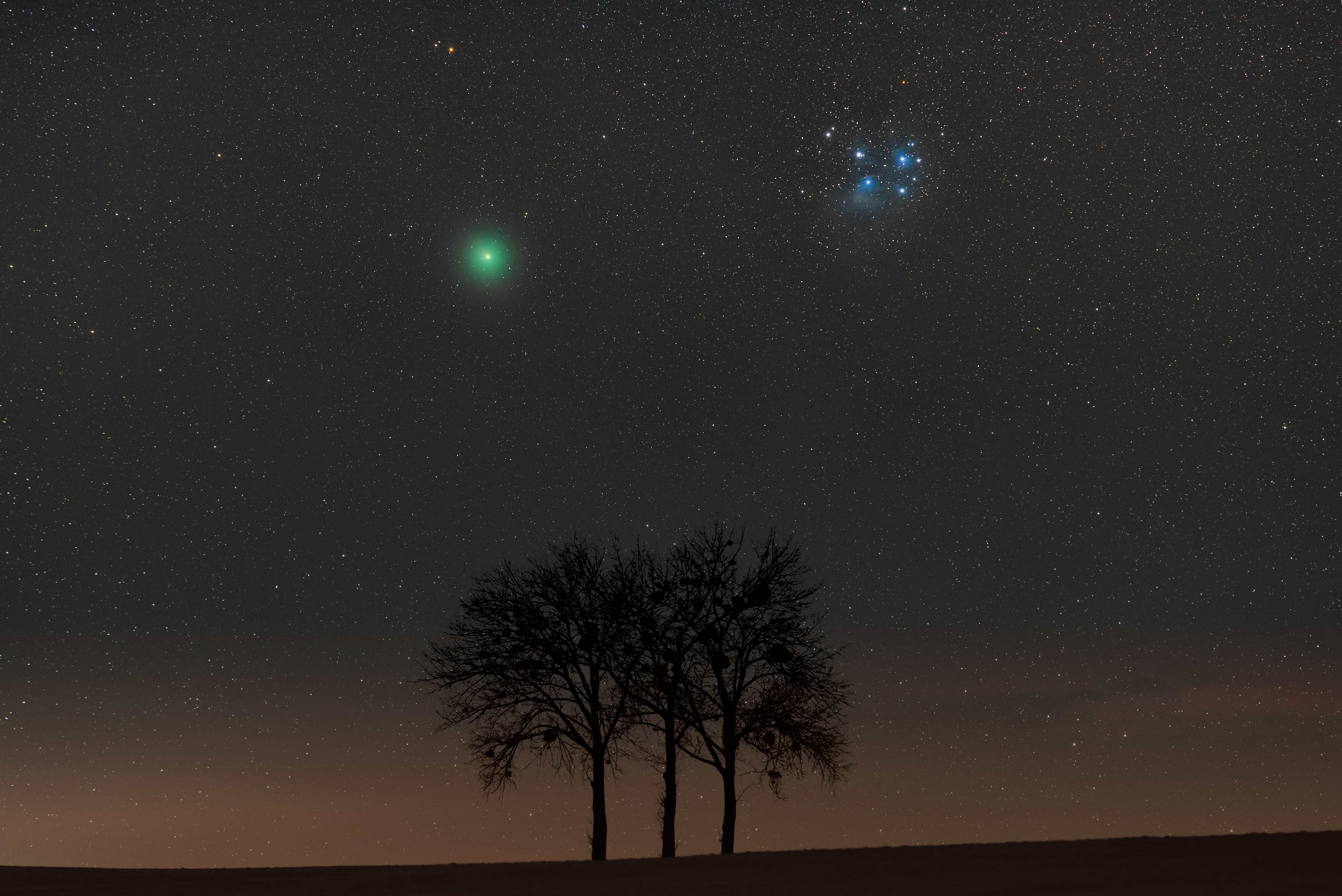 In den Morgenstunden des 16. Dezember 2018 bot sich die einmalige Gelegenheit, ein idyllisches Stimmungsbild vom untergehenden Kometen Wirtanen und den Plejaden aufzunehmen!