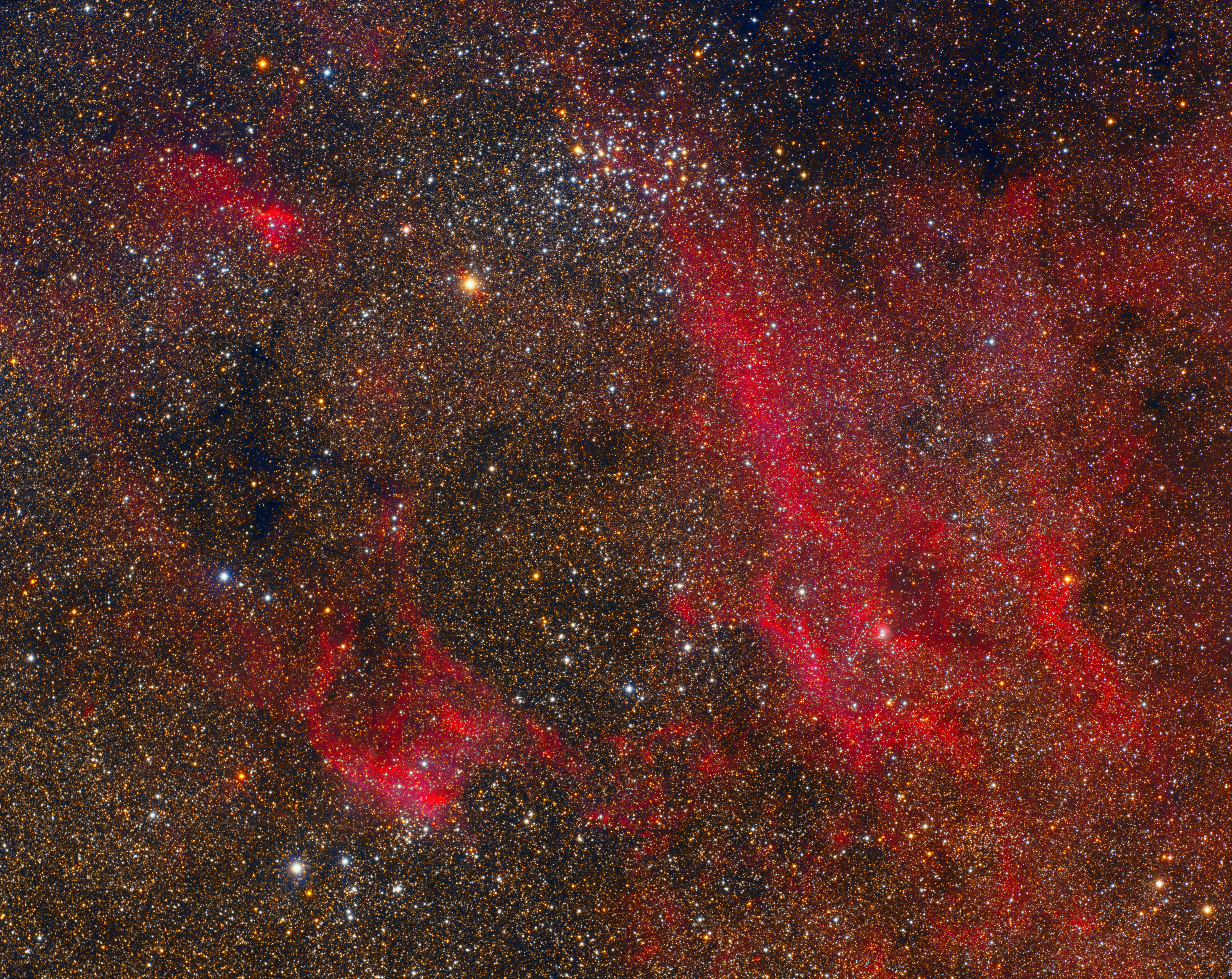 Ein Wishing Well ist ein Wunschbrunnen. Der Sternhaufen wird so genannt, weil sein Anblick an die Münzen erinnert, die man auf dem Boden eines solchen Brunnen findet. Eine andere Bezeichnung ist Football Cluster, wegen seiner ellipsoiden Form. Der offene Haufen thront hier im Bild über den HII-Regionen, die ich mit ablichten wollte. Die ganze Szenerie befindet sich direkt östlich vom hellen Carina-Nebel. Südlich befindet sich der Statue of Liberty-Nebel (NGC3576), der gerade eben nicht mehr im Bild ist. Der Sternhaufen wurde von Nicolas Louis de Lacaille im Jahre 1751 entdeckt. Lacaille zeigt sich für einige Entdeckungen des Südhimmels verantwortlich. Ein Ausschnitt des Sternhaufens war das First Light des Hubble Space Telescope im Jahre 1990. Wie man sieht, enthält der Sternhaufen reichlich blaue Sterne sowie einige rote Sterne. Ich habe immer angenommen, dass die Farbe aufs Alter eines Sterns schließen lässt, aber die Masse des Sterns spielt hier auch eine Rolle. Diejenigen Sterne die bereits mit sehr großen Massen an den Start gegangen sind, haben bereits ihren Wasserstoffvorrat aufgebraucht und sind zu Roten Riesen herangewachsen. Das erklärt die unterschiedlichen Sternfarben in solchen offenen Sternhaufen. Wer also nicht so schlingt, lebt länger. Links vom Wishing Well Cluster befindet sich der Emissionsnebel WHR97, sowie einige HH-Objekte. Unten links im Bild der offene Haufen und Emissionsnebel 3572. In diesem Sternhaufen befindet sich der PN G290.7 +00.2, viel Spaß beim Suchen! Rechts im Bild, die Aufhellung in der großen HII Region ist NGC 3502, ein Reflexionsnebel. Ganz rechts im Bild, mittig, der offene Haufen Trumpler 17. Der helle, gelbe Stern gleich unterhalb des Wishing Well ist Chi Carinae. Durchs Bild ziehen sich unzählige rote Nebel, teilweise mit bogenförmigen Filamenten. Ziel der Bildbearbeitung war es diese zu betonen, ohne dabei die Farbdifferenzierung zu verlieren. So erkennt man auch noch gut die Blauanteile der Nebel.