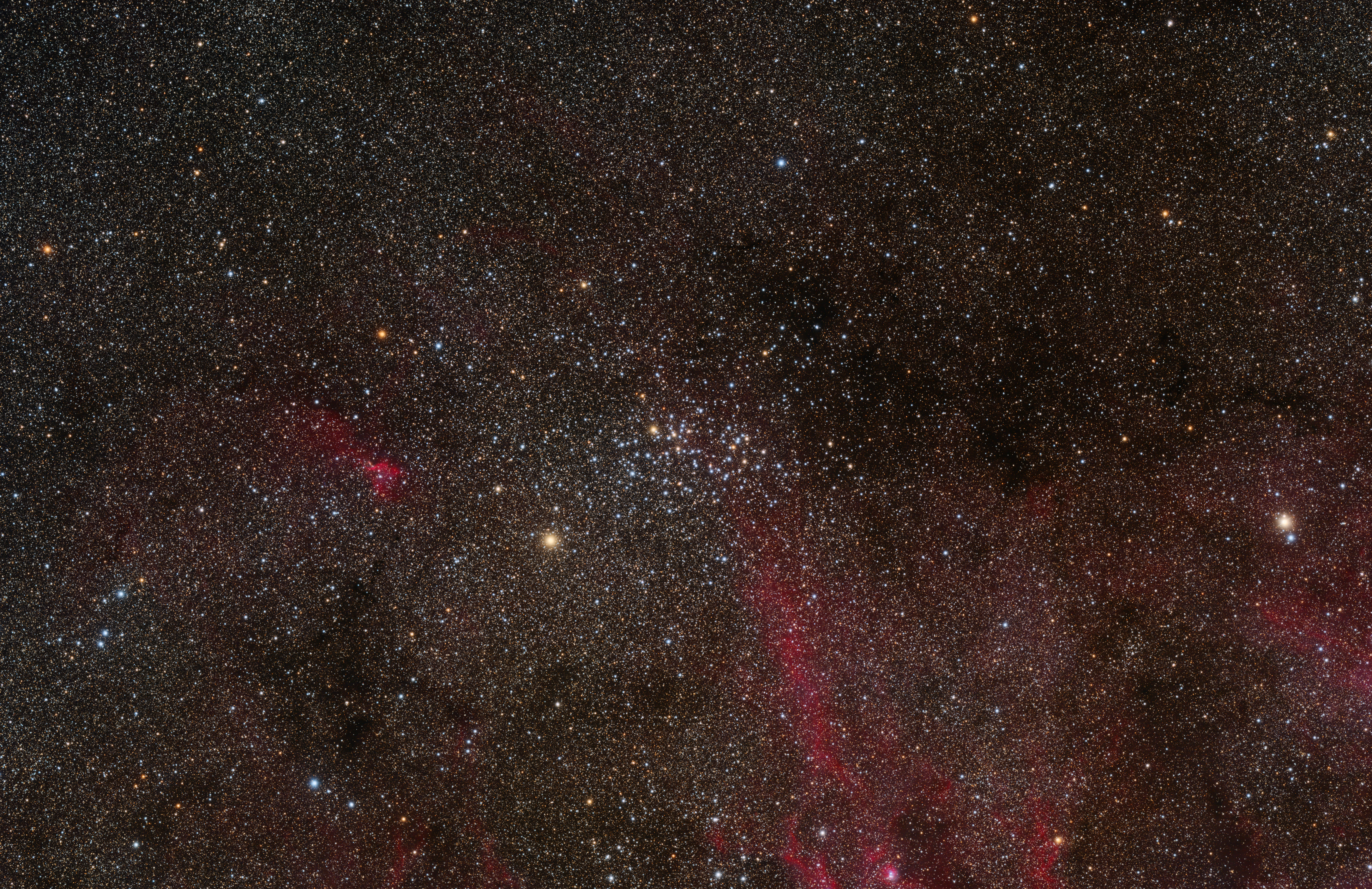 NGC 3532 der Wishing Well Cluster im Sternbild Schiffskiel (Carina). Dieser Sternhaufen ist eingerahmt von Emissionsnebeln und befindet sich zwischen dem bekannten Eta-Carina-Nebel und dem Statue-of-Liberty-Nebel.