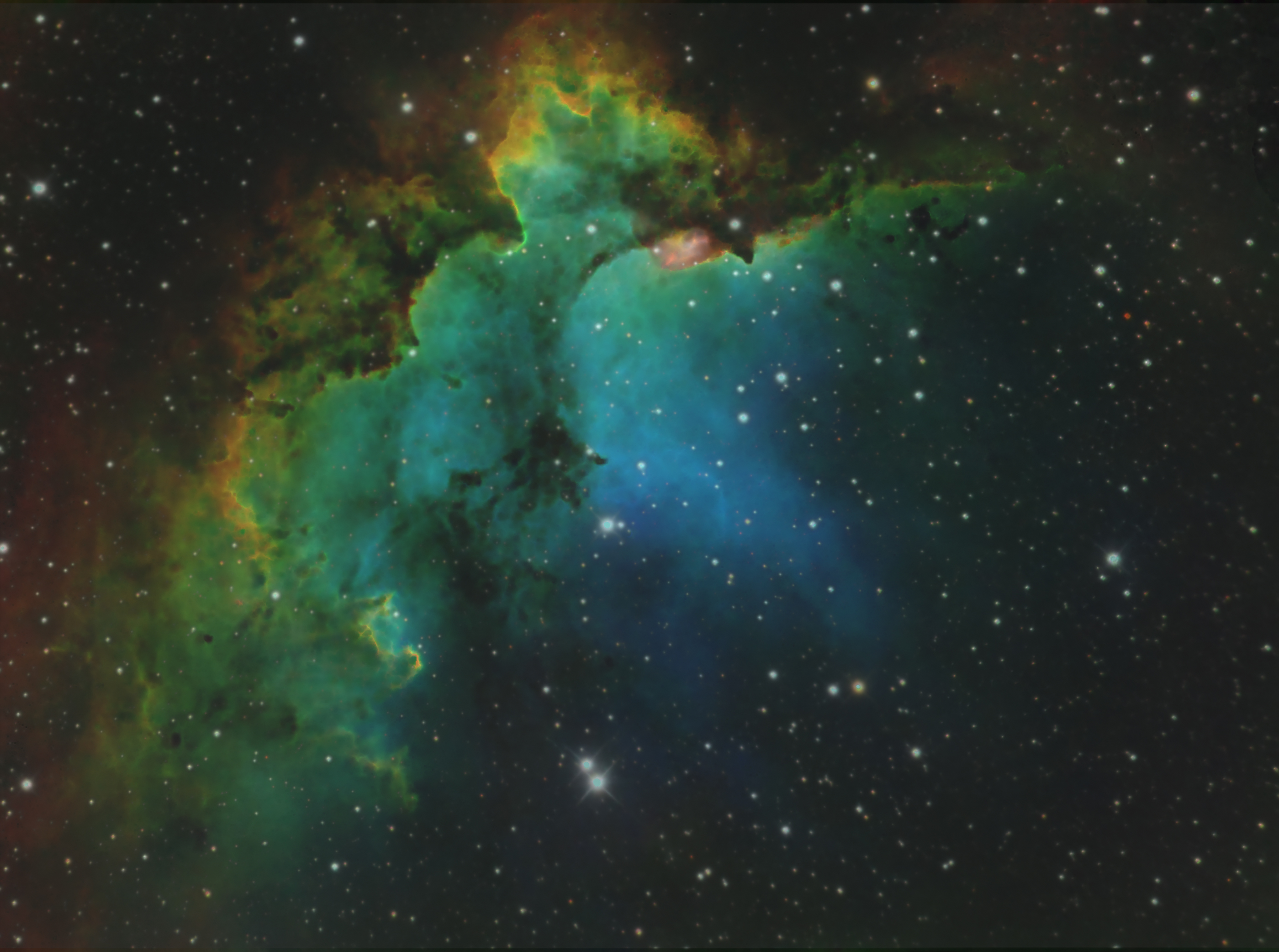 Die englische Bezeichnung für Zauberer ist mittlerweile der gebräuchlichste Name für diesen schwachen Emissionsnebel im Sternbild Kepheus. Seine am häufigsten gebrauchte Katalogbezeichnung ist NGC 7380. Diese bezeichnet allerdings den mit dem Nebel verbundenen offenen Sternhaufen. Der Nebel enthält, wie viele ähnliche Sternentstehungsgebiete, bizarre Formen, die aus der Wechselwirkung der jungen Sterne mit der umliegenden Gas- und Staubwolke entstehen. Dadurch zeigen sie oft auch einen besonderen ästhetischen Reiz. Dass Bild entstand mittels einer größeren Zahl von Aufnahmen mit Schmalbandfiltern der Elemente Wasserstoff, Sauerstoff und Schwefel, die nach dem Hubble-Schema zusammengefügt wurden. Weitere Bilder auf www.astro-cabinet.com