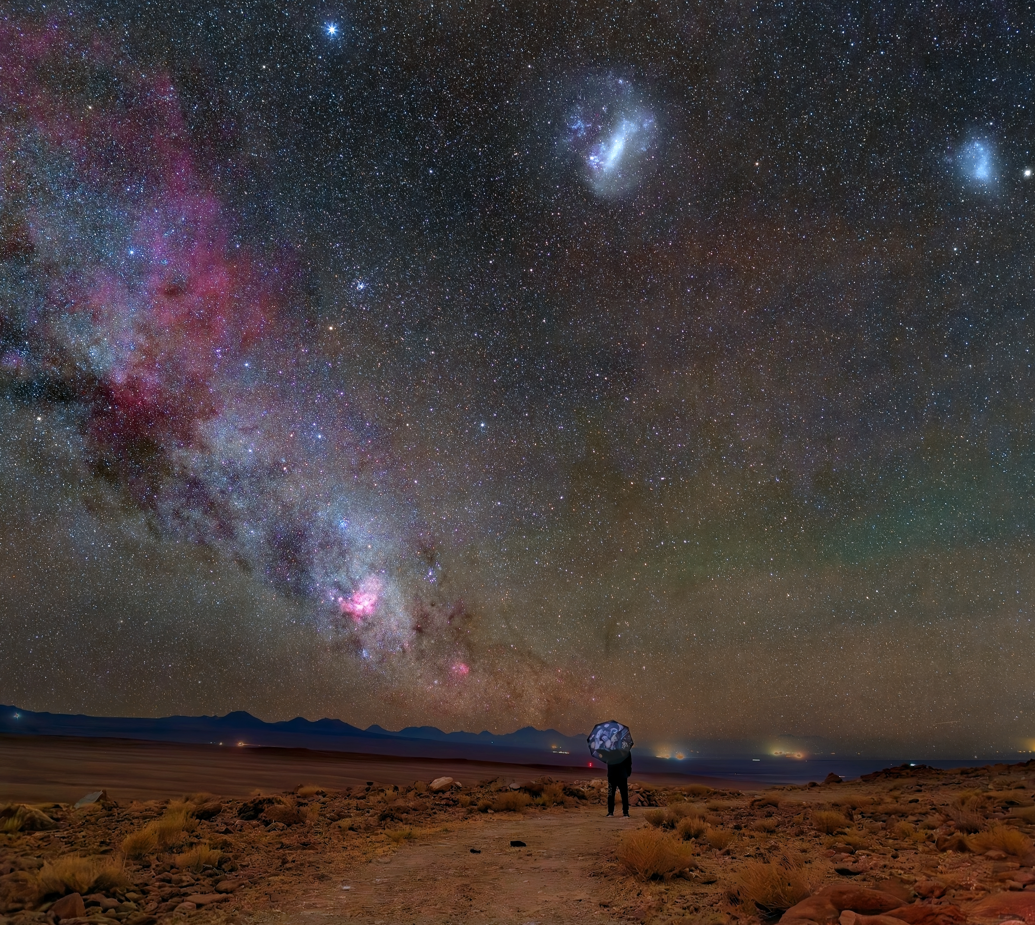 Unter dem kristallklaren Himmel der Atacama erhebt sich die Milchstraße neben den Magellanschen Wolken, zwei nahen Satellitengalaxien unserer Sonne. Ein sternenübersäter Regenschirm im Vordergrund, inspiriert von Van Goghs »Sternennacht«, vereint gemalte Fantasie mit echtem Sternenlicht. Die Szene spiegelt wider, wie Kunst und Astronomie den gleichen Nachthimmel interpretieren und feiern.