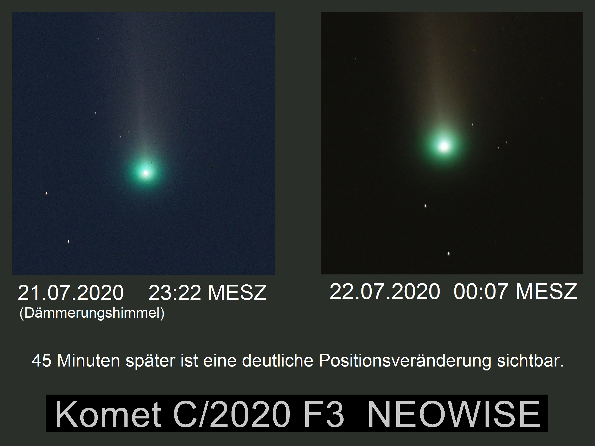 Hier sieht man die Wanderung des Kometen Neowise Richtung Westen, etwa einen Tag vor der größten Erdnähe. Nach 45 Minuten hat er sich gegenüber den Sternen schon gut fortbewegt. Die Bilder sind starke Ausschnitte aus den Originalfotos.