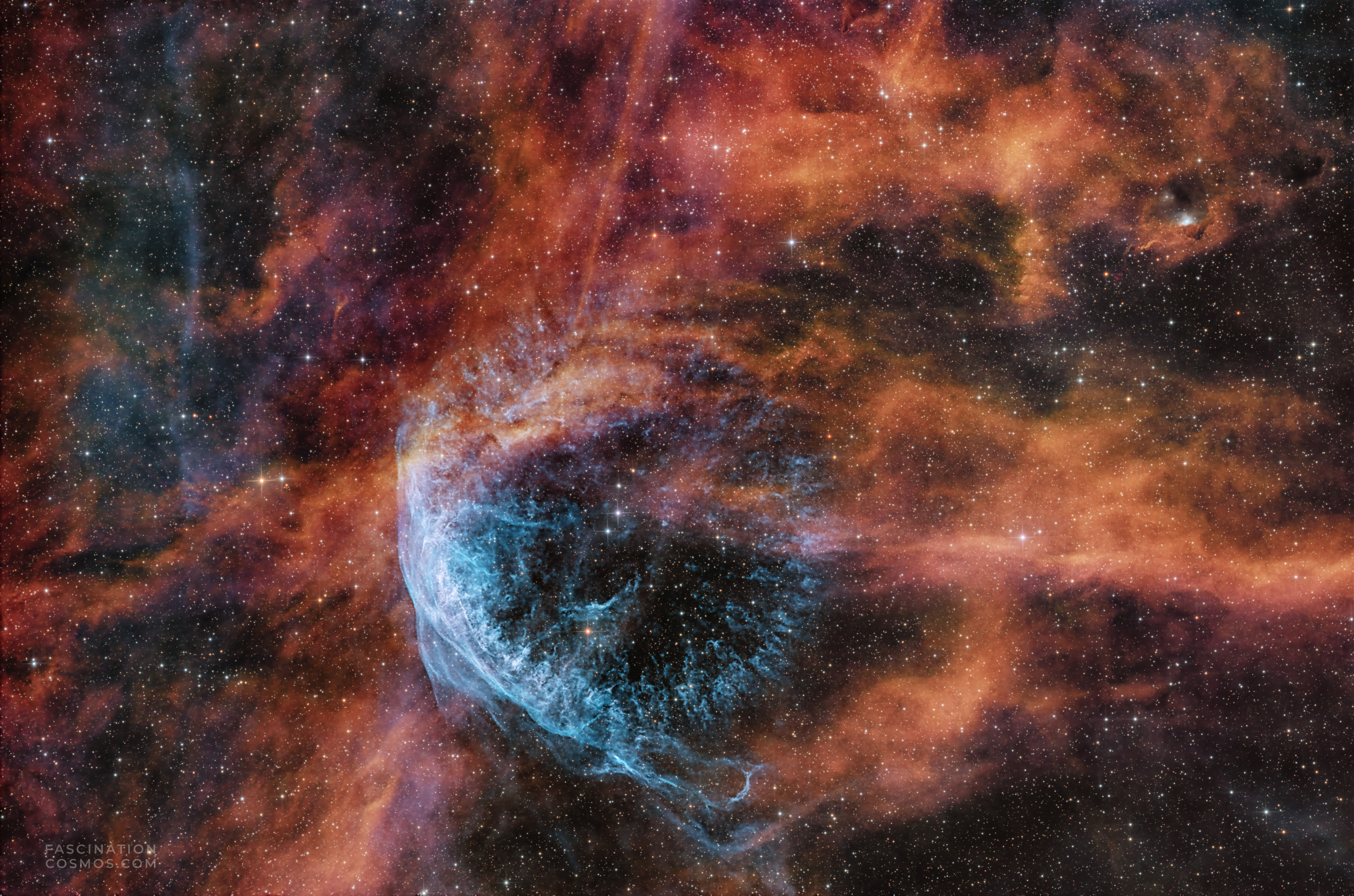 WR 134 ist so einer: ein veränderlicher Wolf-Rayet-Stern. Aber was macht den so besonders? Das sind Sterne, die sind am Ende ihres Lebens angekommen sind. Sie pusten ihre äußeren Hüllen geradezu ins All hinaus mit irrsinniger Geschwindigkeit, über 1000 Kilometer pro Sekunde – ein Sternenwind, der es in sich hat! Und dieser Wind, diese Materie, die da rausgeschleudert wird, die bildet um den Stern herum so eine Art Blase, einen »Blasennebel«, der auf dem Bild dann durch die Langzeitbelichtungen mit meinem OIII-Filter so wunderbar zartbläulich zu sehen ist.