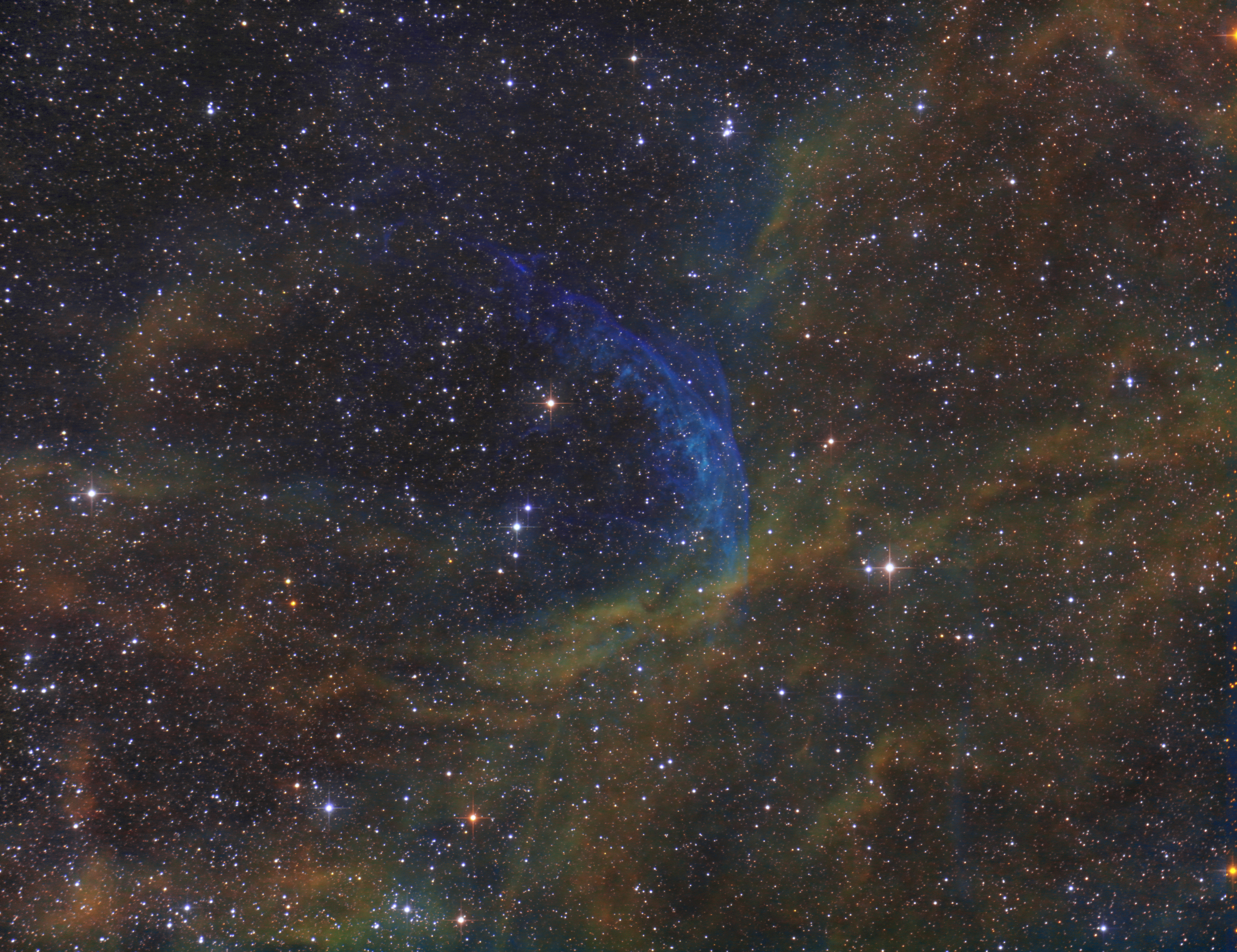 In der Nähe des Crescentnebels NGC 6888 befindet sich ein weiteres, aber schwierigeres Objekt, die Nebel um den Wolf-Rayet-Stern WR 134. Das Bild ist ein Falschfarbenbild in der Hubble-Palette, bei der den Farbkanälen R,G,B die Schmalbandbilder SII, Ha, OIII zugewiesen werden. Wolf-Rayet-Sterne sind massereiche Sterne, die am Ende ihres Lebens große Mengen Gas abstoßen, das durch die ionisierende Strahlung des Sterns zum Leuchten gebracht wird.