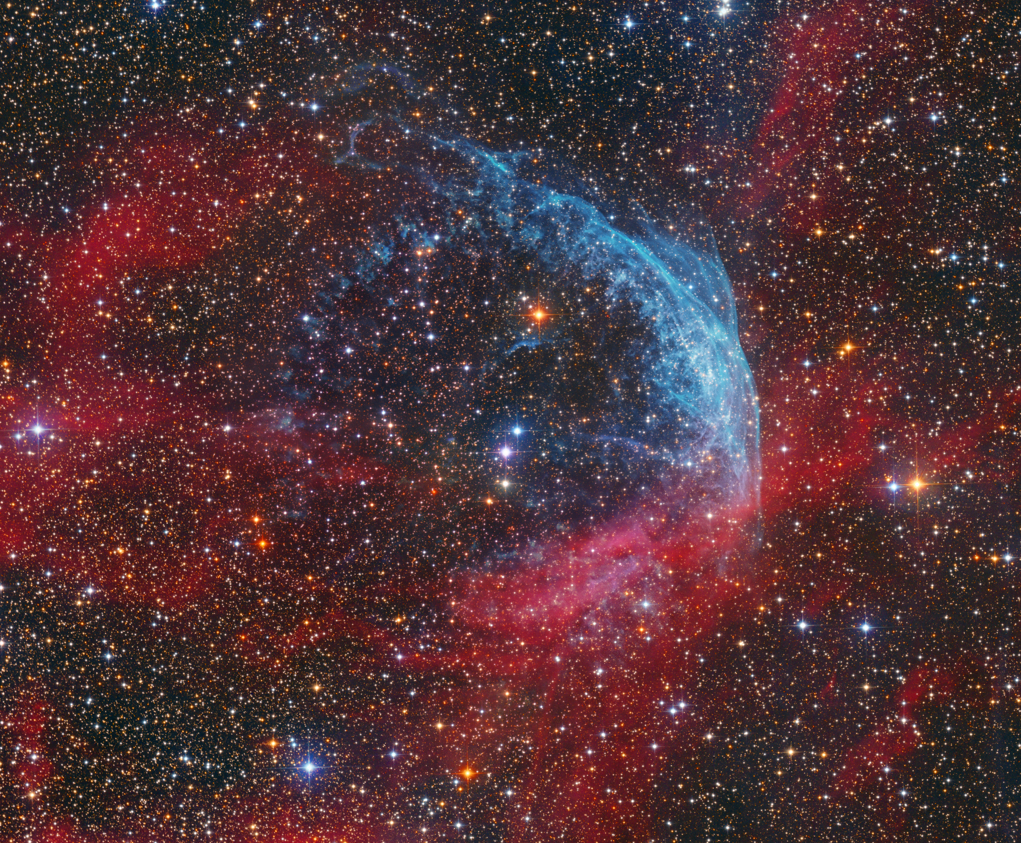 Etwas Geduld war nötig, um das folgende Bild fertig zu stellen. Es handelt sich um den Wolf-Rayet-Nebel, bzw. den WR-Stern 134 mit umliegendem Nebel. Bei der Bearbeitung fiel öfter mal der Satz »Hey, warum hat der Stern in der Mitte denn so eine komische Farbe?« Die violette Farbe ist vermutlich der Natur der WR-Sterne geschuldet, die ein außergewöhnliches Spektrum zeigen, in dem vor allem Helium eine dominante Rolle spielt. WR134 ist quasi der Prototyp dieser Sternkategorie. Die Herren Wolf und Rayet beobachteten 1867 drei solcher Sterne, alle im Sternbild Schwan. Kleiner Fun Fact: Das Element Helium wurde ein Jahr später erst entdeckt (1868) und das auch wieder durch einen Astronomen. Wolf-Rayet-Sterne stoßen große Mengen Materie ab was zu leuchtenden Gasnebeln führt die radial vom zentralen Stern weg führen. Man sieht in unserem Bild deutlich die radiale Struktur um den zentralen Stern. Der hellste Teil des Nebels ist dabei schon recht kräftig, aber der schwache innere Ring war eine harte Nuss. Das Bild entstand im Zeitraum eines Jahres mit unterschiedlichen Kameras und Filtern. RGB sowie OIII wurden 2020 mit der Mono CCD aufgenommen und im Juli diesen Jahres haben wir mit der Farbkamera und DuoNarrowbandfilter noch einmal nachgelegt.