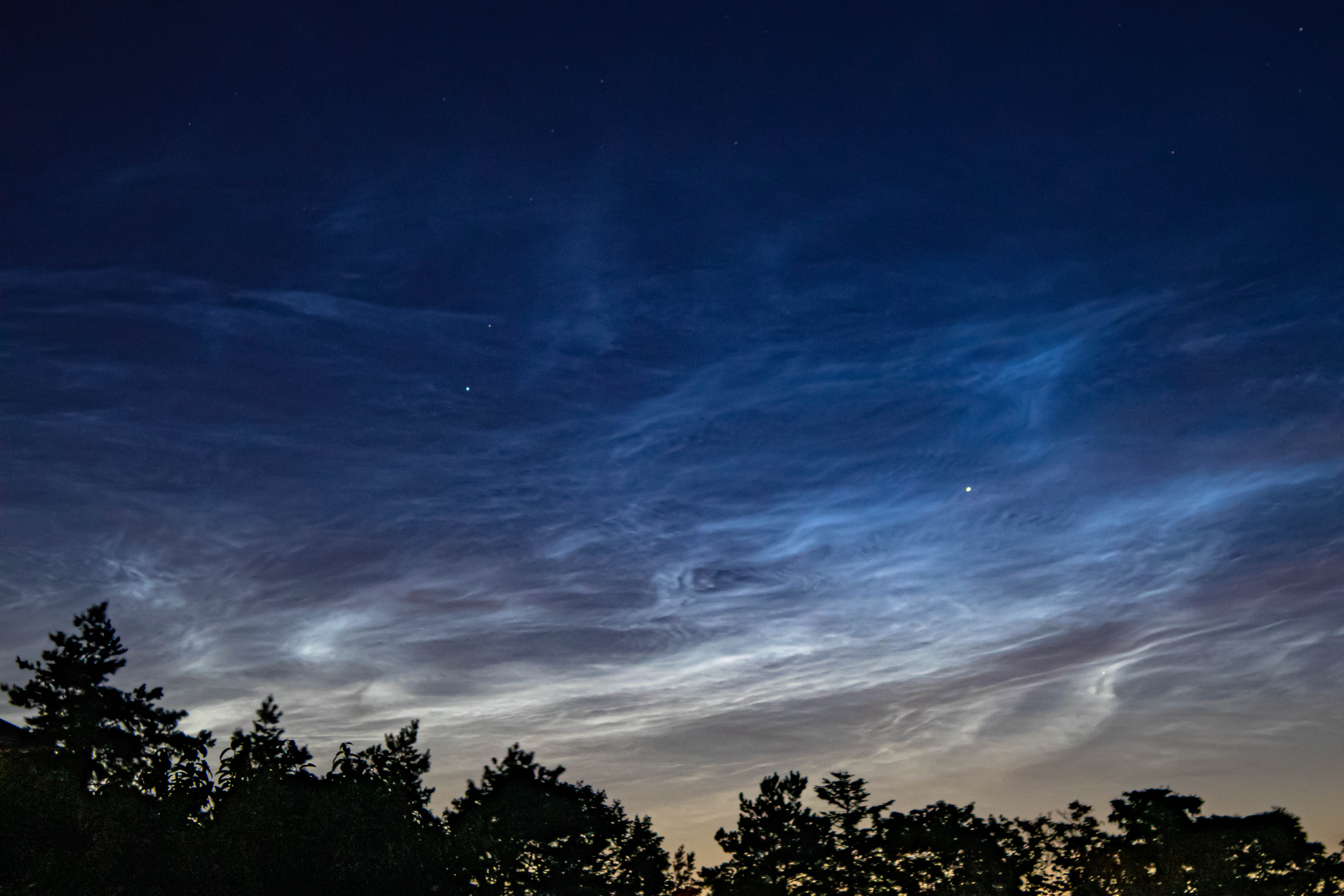 Erste Sichtung meinerseits von Leuchtenden Nachtwolken 2024. Ab 22:30 Uhr tauchte das wunderschöne Display am Nordhimmel auf. Am Anfang relativ hoch mit bis zu 30° zog es sich dann auf 10° Höhe über dem Horizont zurück. Gegen 23 Uhr zogen dann Schleierwolken aus Westen herein und die NLCs verschwanden so langsam dahinter.