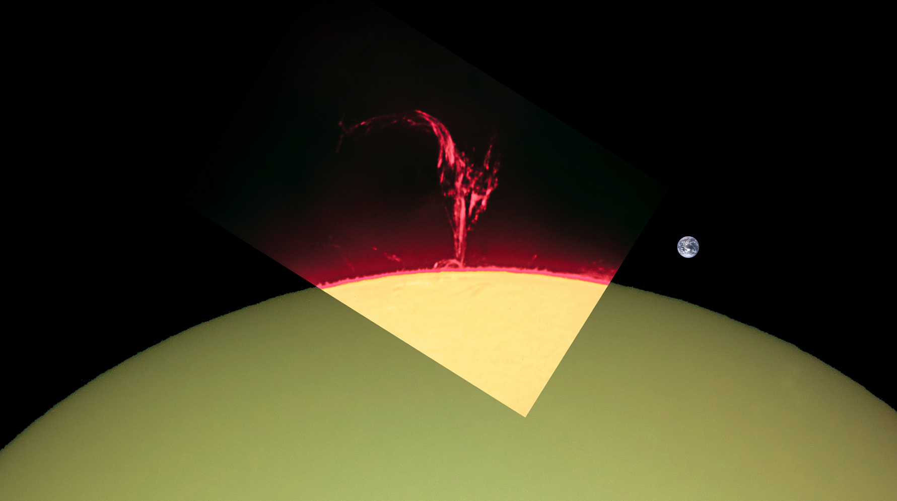 Die drittstärkste Sonneneruption in diesem Zyklus. Der CME wurde in eine Weißlichtaufnahme eingefügt. Die Erde dient als Größenvergleich. www.krobath-koechl.at/pacheiner.at