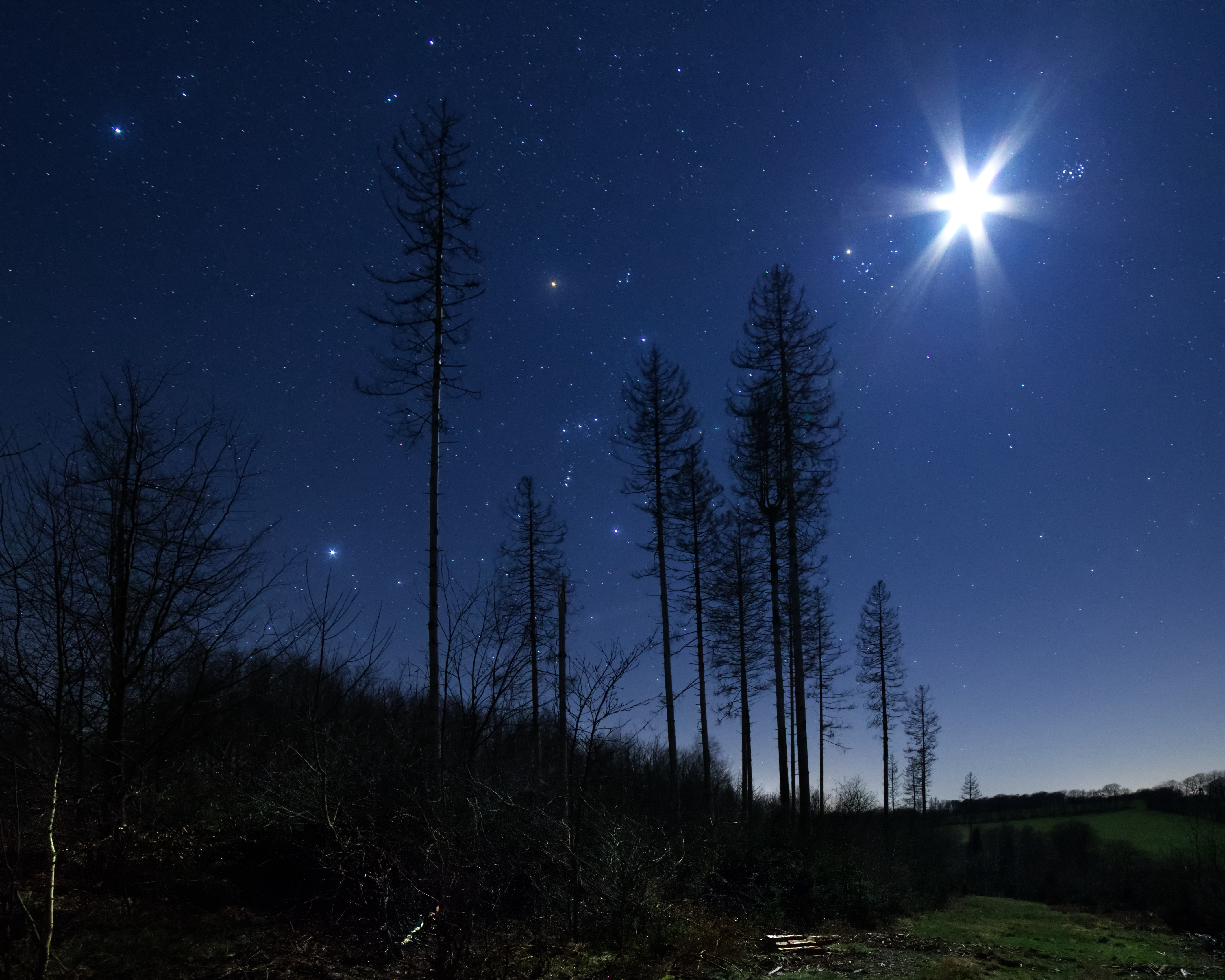 Mondnächte gelten unter Sternfreunde als nicht gerade interessant. Überstrahlt doch das helle Licht unseres Trabanten Objekte wie Galaxien, Sternhaufen oder Gasnebel. DeepSky- Astrofotografie ist in der Zeit um Vollmond eher unrentabel. Auch sind bei weitem nicht alle Sterne, die man normalerweise in einer klaren, mondlosen Nacht beobachten kann, sichtbar. Nur die hellsten Sterne der Sternbilder zeigen sich am Firmament. Doch gerade diese Eigenschaft kann von Vorteil sein. Somit ist es ein Leichtes, Sternbilder schnell an deren hellen Hauptsternen zu erkennen. Und nicht zuletzt taucht das silbrige Licht des Mondes die nächtliche Landschaft in eine unwirkliche, mystische und dennoch romantische Atmosphäre. In der Nacht vom 9. auf den 10. Februar 2022 stand der zu 60 Prozent beleuchtete, acht Tage alte Mond exakt im Goldenen Tor der Ekliptik, also zwischen den Sternhaufen der Hyaden und der Plejaden. Die Aufnahme entstand in einer Waldlichtung im Hunsrück. Zu erkennen sind auch die bekannten Wintersternbilder.