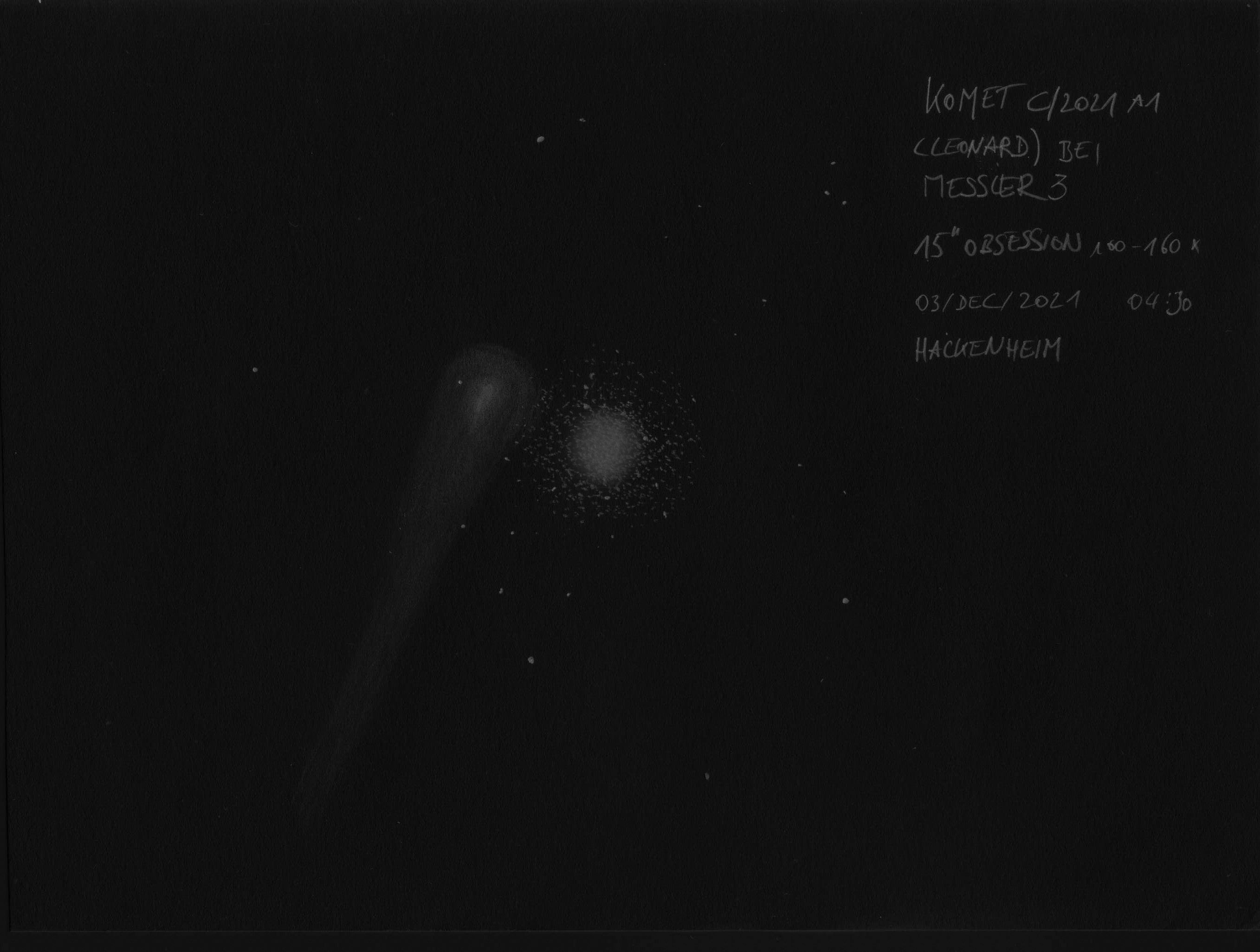 Am 3. Dezember 2021 gegen 04:30 Uhr war der Komet genau auf Höhe von Messier 3 und ein Teil der Koma ging über mit den Außenbereichen des Kugelsternhaufens. Ich hatte Glück mit einer großen Wolkenlücke inmitten wochenlang bedeckten Himmel. Schön im 15er ist dann natürlich die Auflösung des KS in Einzelsterne und dann der Farbunterschied, klar blau/grün der Komet.