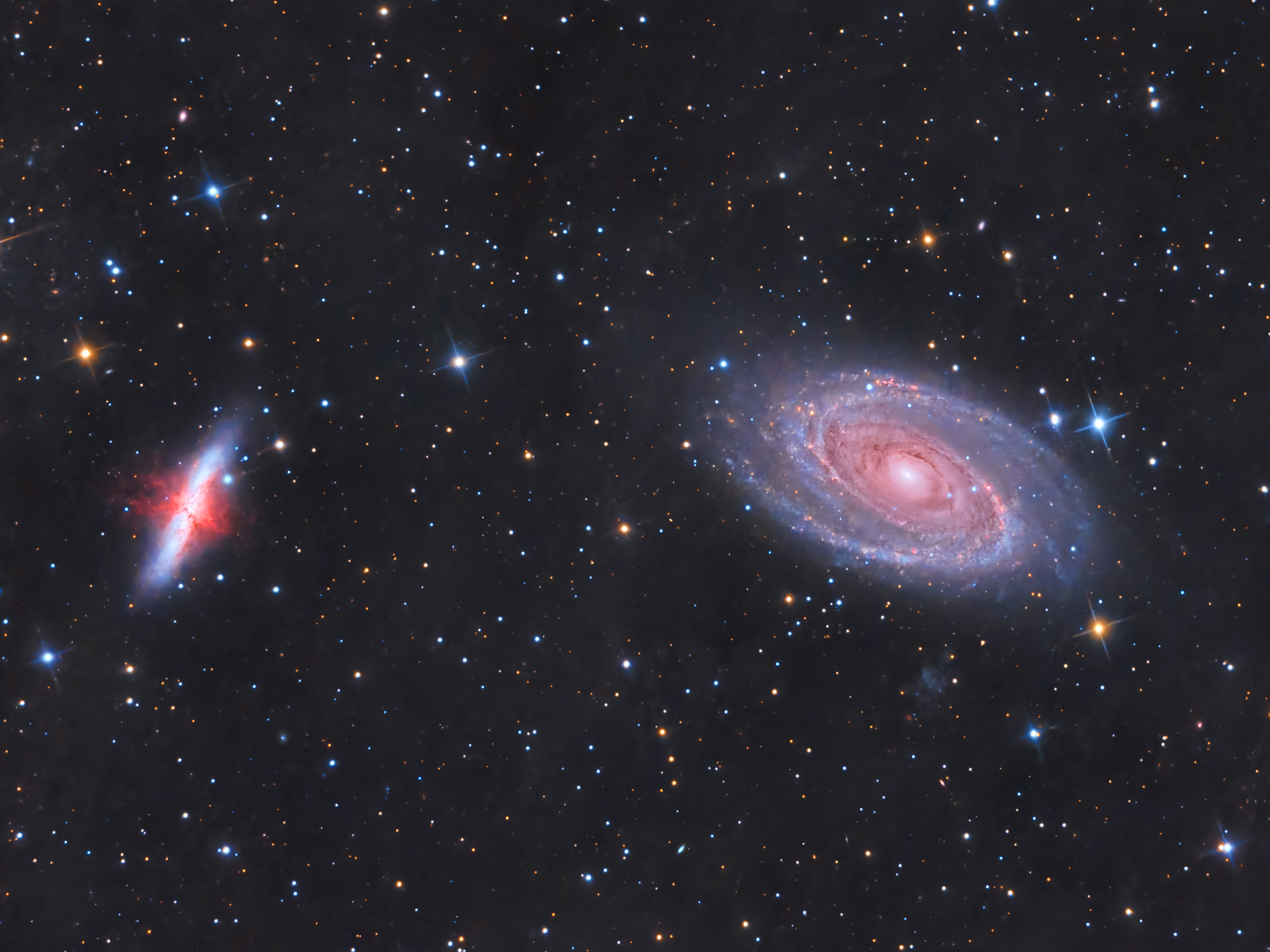 Messier 81 (auch bekannt als Bodes Galaxie, M81 oder NGC 3031) ist eine große Spiralgalaxie, die etwa 11,8 Millionen Lichtjahre von der Erde entfernt liegt und eine scheinbare Helligkeit von 6,94 hat. Mit markanten und klar definierten Spiralarmen ist M81 ein hervorragendes Beispiel für eine große Spiralgalaxie. Die Bode-Galaxie ist nach Johann Elert Bode benannt, dem deutschen Astronomen, der sie am 31. Dezember 1774 zusammen mit der nahegelegenen Galaxie M82 entdeckte. Er beschrieb das Paar als »zwei kleine Nebel, die um 3/4 Grad voneinander getrennt sind«. Messier 82 (auch bekannt als Zigarrengalaxie, M82 oder NGC 3034) ist eine Starburst-Galaxie von der Seite, die 11,4 bis 12,4 Millionen Lichtjahre von der Erde entfernt liegt und eine scheinbare Helligkeit von 8,41 hat. M82 ist die der Erde am nächsten gelegene Starburst-Galaxie und dient als Prototyp für diesen Galaxientyp. M82 ist eine der kleinsten im Messier-Katalog aufgeführten Galaxien und ist etwa 80 Grad zu unserer Sicht geneigt. Ihre Form hat ihr den Namen Zigarre eingebracht. Die Sternentstehungsaktivität in M82 wird durch die Wechselwirkung der Galaxie mit ihrem großen Nachbarn M81 verursacht, die die Galaxie in einem Prozess, der vor etwa 100 Millionen Jahren begann, durch Gezeitenkräfte deformiert. Pierre Méchain entdeckte M81 und M82 unabhängig voneinander im August 1779 und meldete die Entdeckung Charles Messier, der die Standorte beider Objekte bestimmte und sie am 9. Februar 1781 in seinen Katalog aufnahm.