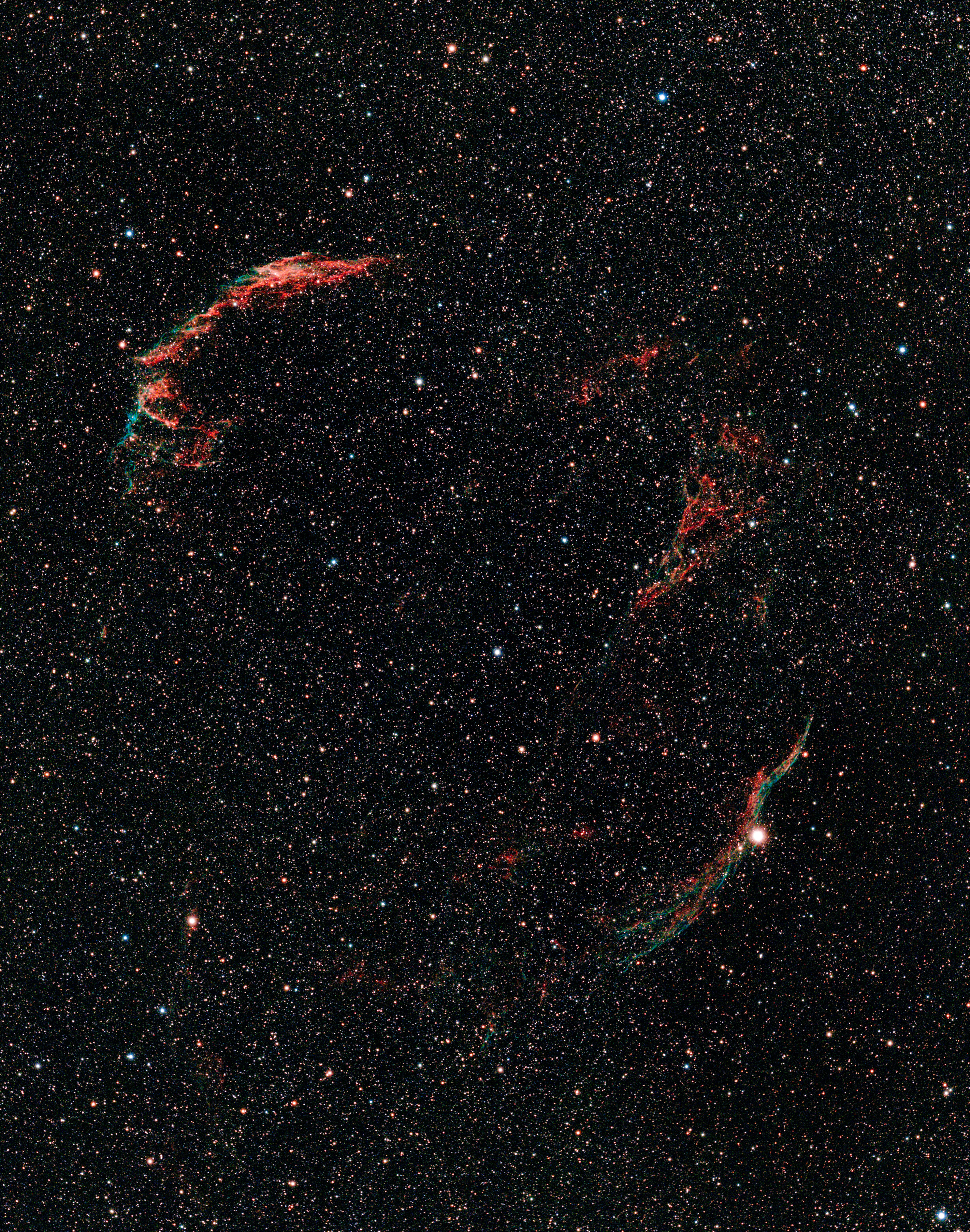 Dieses Foto der Gesamtansicht des Zirrus-Nebels entstand mit dem Mosaik-Modus des Smart-Teleskops Vespera II in Verbindung mit CLS-Filter. Links oben ist die "Hexenhand" und rechts unten der »Hexenbesen« bzw. »Sturmvogel« zu erkennen.