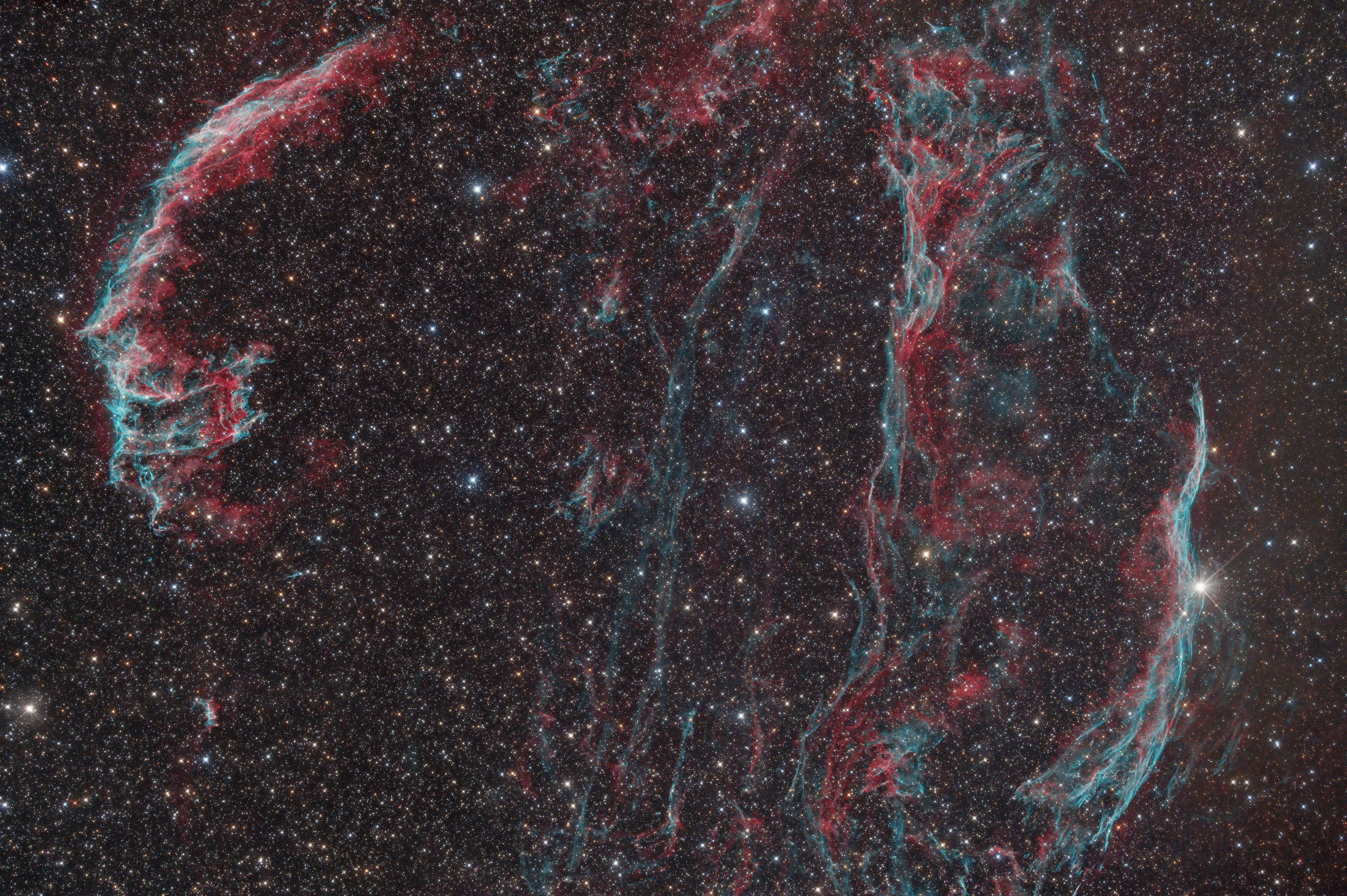 Der Zirrusnebel oder Schleiernebel ist der im optischen Spektrum sichtbare Teil des Cygnusbogens, einer Ansammlung von Emissions- und Reflexionsnebeln, die sich in einer Entfernung von rund 2400 Lichtjahren befinden. Sie sind zusammen der Überrest einer Supernova, die vor etwa 8000 Jahren stattfand. Zwischen den beiden äußeren Bögen befindet sich NGC 6979, auch bekannt als Pickerings Dreieck. Das Bild enthält auch Aufnahmen, die mit einem Schmalbandfilter für H-Alpha und OIII gemacht wurden. Dadurch werden die Nebelstrukturen verstärkt.