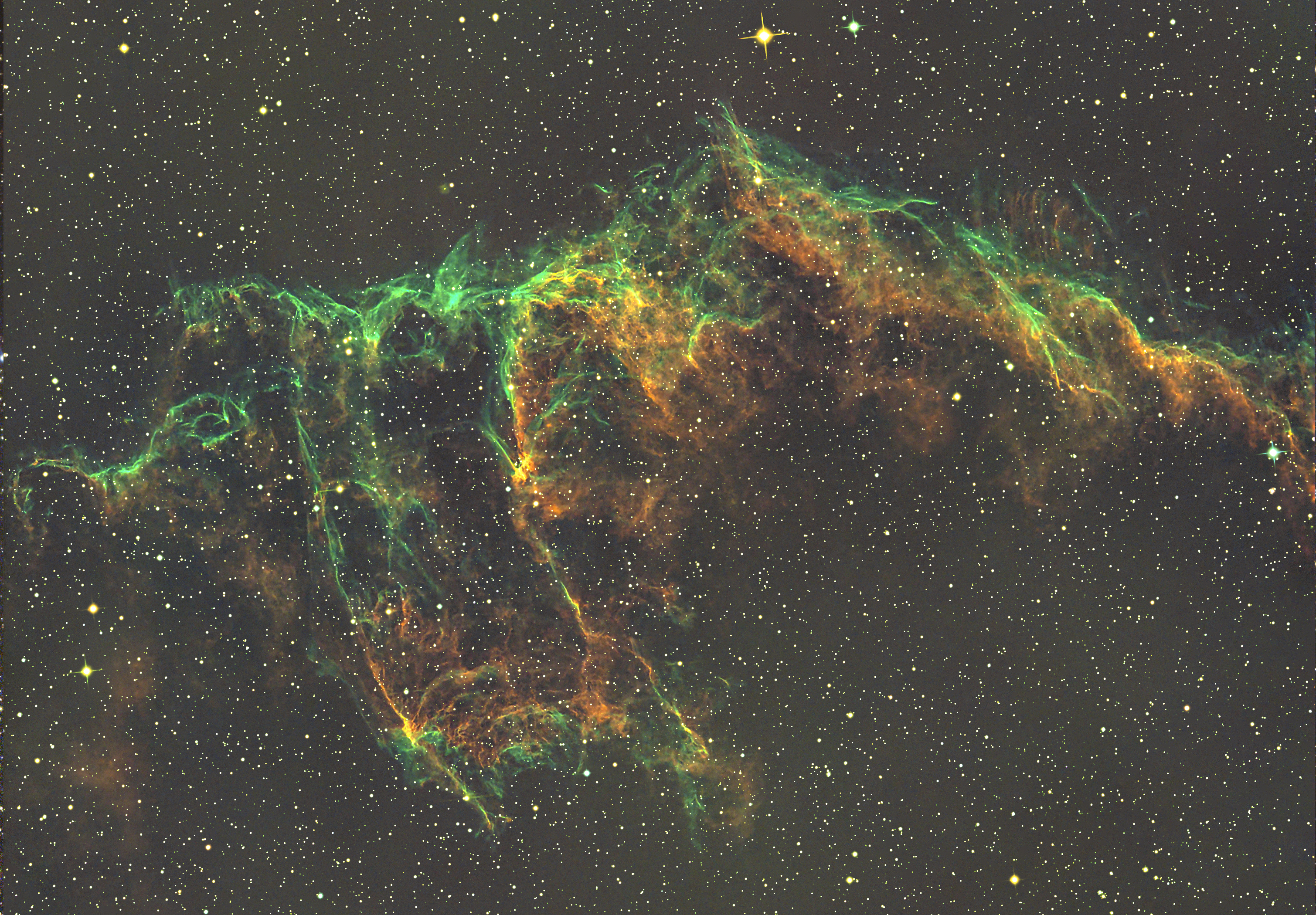 Der Zirrusnebel ist eine Ballung von Reflexions- und Emissionsnebeln im Sternbild Schwan. Dieser Nebel ist der Überrest einer Supernova, eines explodierten Sterns, vor etwa 8000 Jahren. Diese Detailaufnahme bildet nur einen kleinen Teil des gesamten Nebels ab und wird aufgrund seines Aussehens inoffiziell „Fledermausnebel“ genannt. Entfernung zur Erde rund 1400 Lichtjahre. Fotografiert mit Astro-Kamera ZwoAsi 533 MC Pro (gekühlt auf -5°C ) und Teleskop Lacerta 200/800. Nachgeführt mit Celestron AVX, Guiding mit PHD2. Gesamtbelichtungszeit knapp fünf Stunden bei Einzelbelichtungszeiten bis zu 300 Sekunden