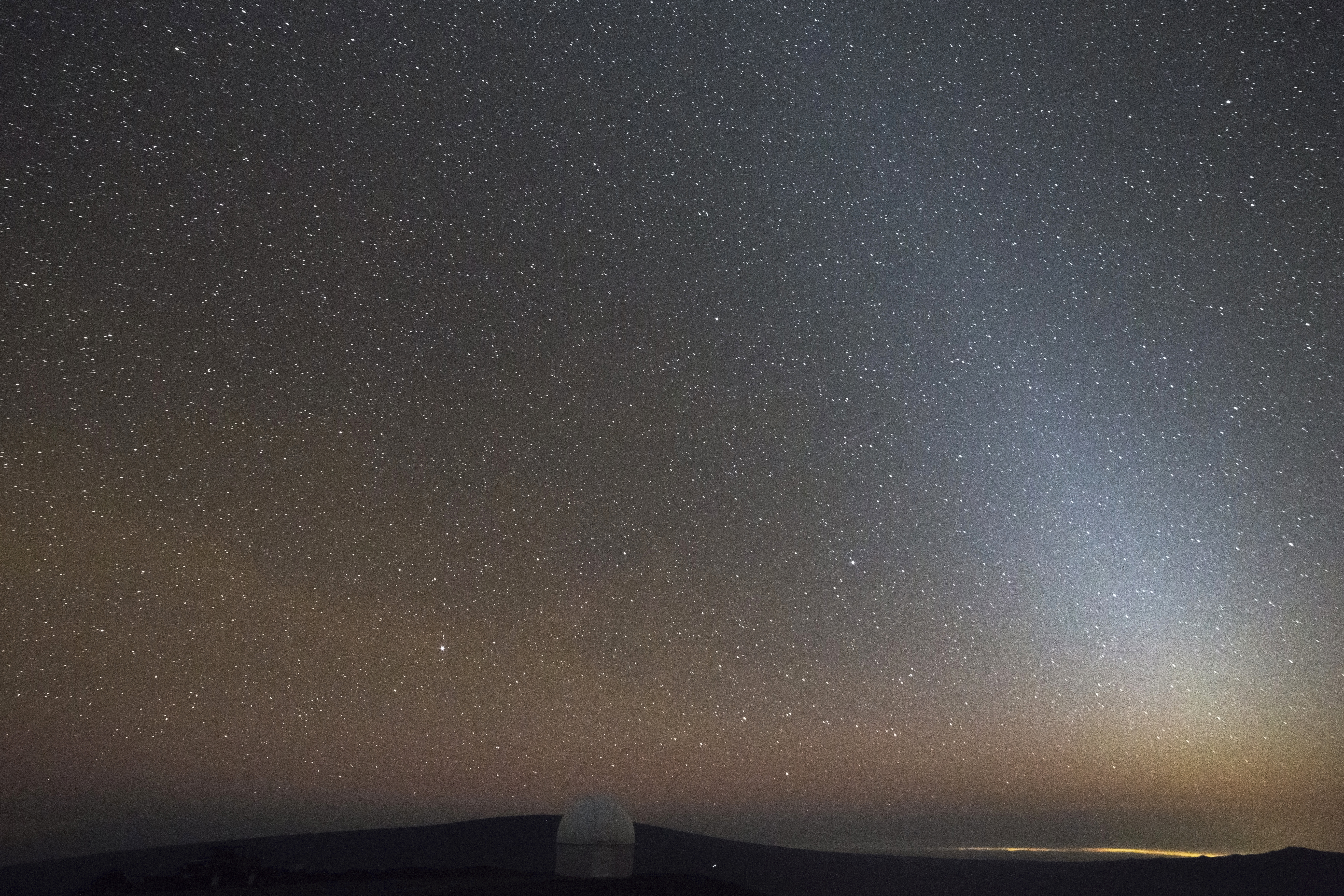 Noch nie gesehen und schon konnte ich es auf dem Mauna Kea fotografieren: das Zodiakallicht! Mit Mühe konnte ich im hellsten Bereich des Lichts die Sterne des Steinbocks identifizieren. Auf der Aufnahme ist der Dom des UH Hilo Educational Telescope abgebildet. Oberhalb des Doms findet sich ein Viereck aus hellen Sternen: Dies sind im Uhrzeigersinn von links unten nach rechts: Achernar (Eridanus) Ankaa (Phoenix) Fomalhaut (Piscis austrinus) und Al Nair (Kranich). Die auffällige Sternenkette rechts oberhalb des Teleskops stammt ebenfalls vom Sternbild Kranich.