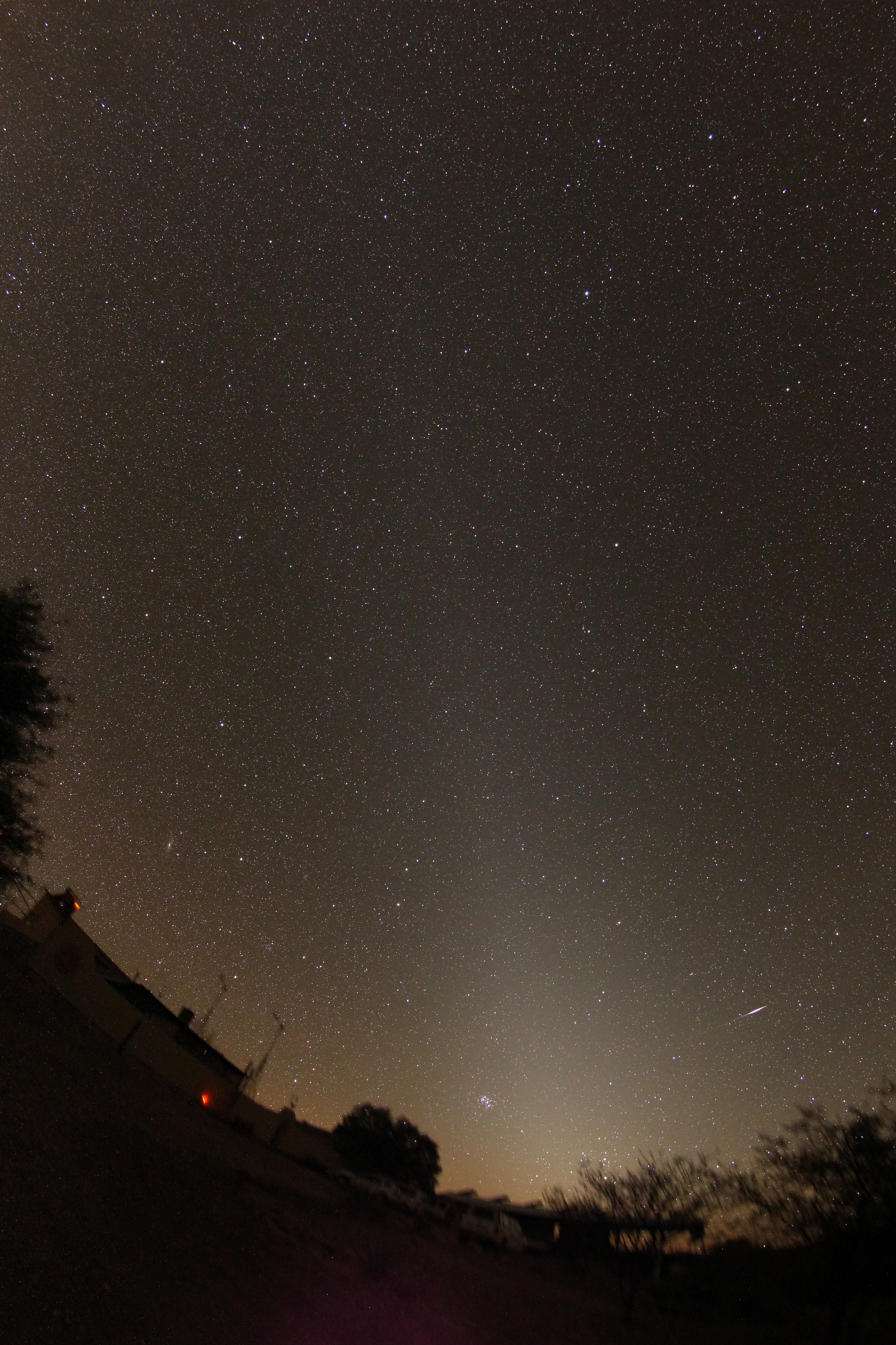 Bei der SuW-Leserreise 2019 nach Namibia auf die Farm Hakos war auch am Morgenhimmel das Zodiakallicht wunderbar sichtbar. Am unteren Bildrand die aufgehenden Plejaden und ein Iridiumflare.