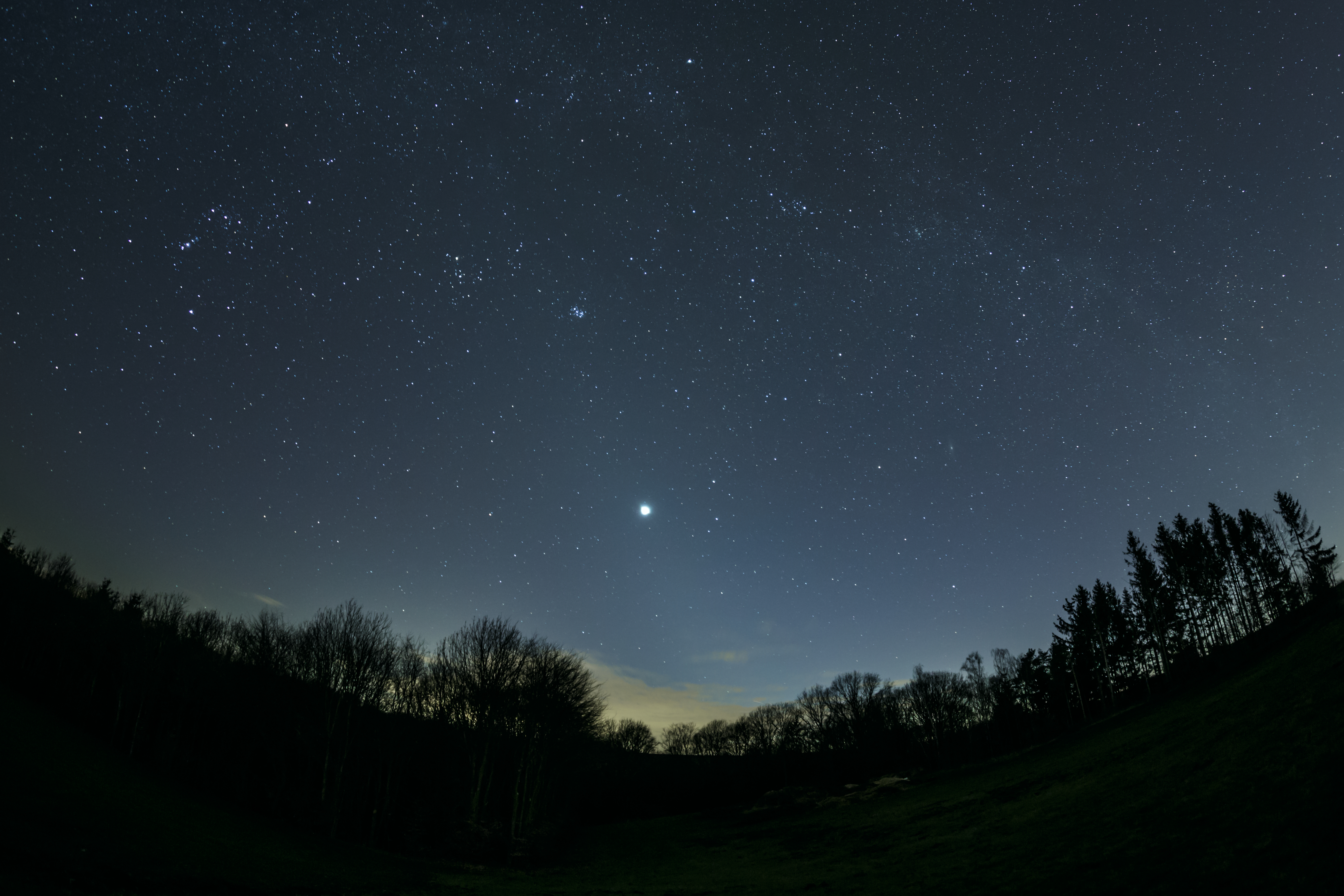 Schon lange war es ein Ziel von mir, einmal das schwache Zodiakallicht zu erwischen. Noch nie zuvor war es mir gelungen. Gestern abend riss der Himmel hinter der Kaltfront eines Tiefs auf, die Transparenz der Luft sehr gut. Mit voller Öffnung meines neuen FishEye-Objektives gelang es mir dann, es zu fotografieren. Venus stand inmitten des schwachen Lichtkegels, daüber schimmerte das Band der Milchstraße.