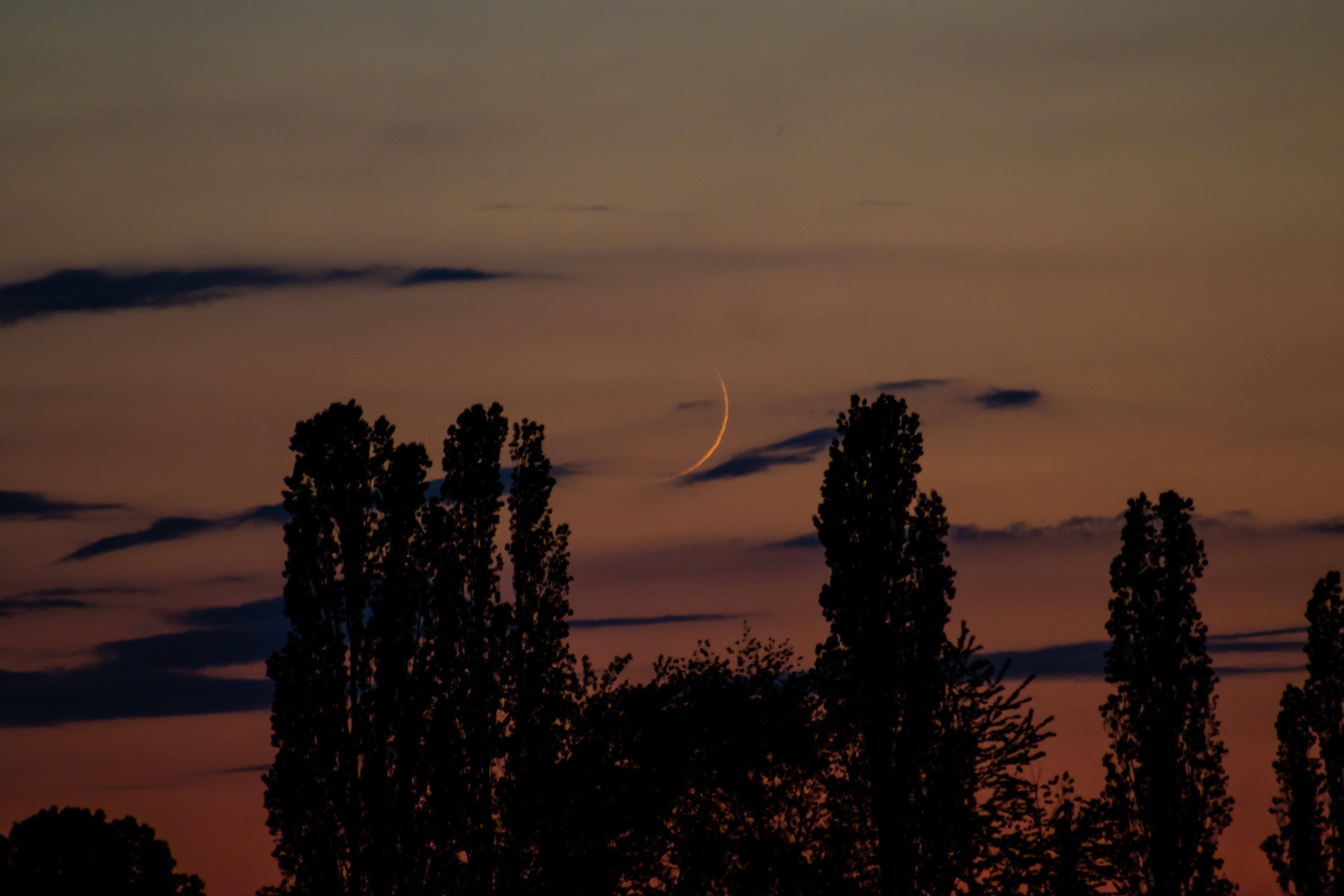 Erste Sichtbarkeit der sehr dünnen Mondsichel nach fast 38 Stunden nach Neumond. Aufgenommen in Sobrigau südlich von Dresden. Zum Aufnahmezeitpunkt war die zu 2,6 Prozent beleuchtete Sichel noch 2,7 Grad über dem Horizont.