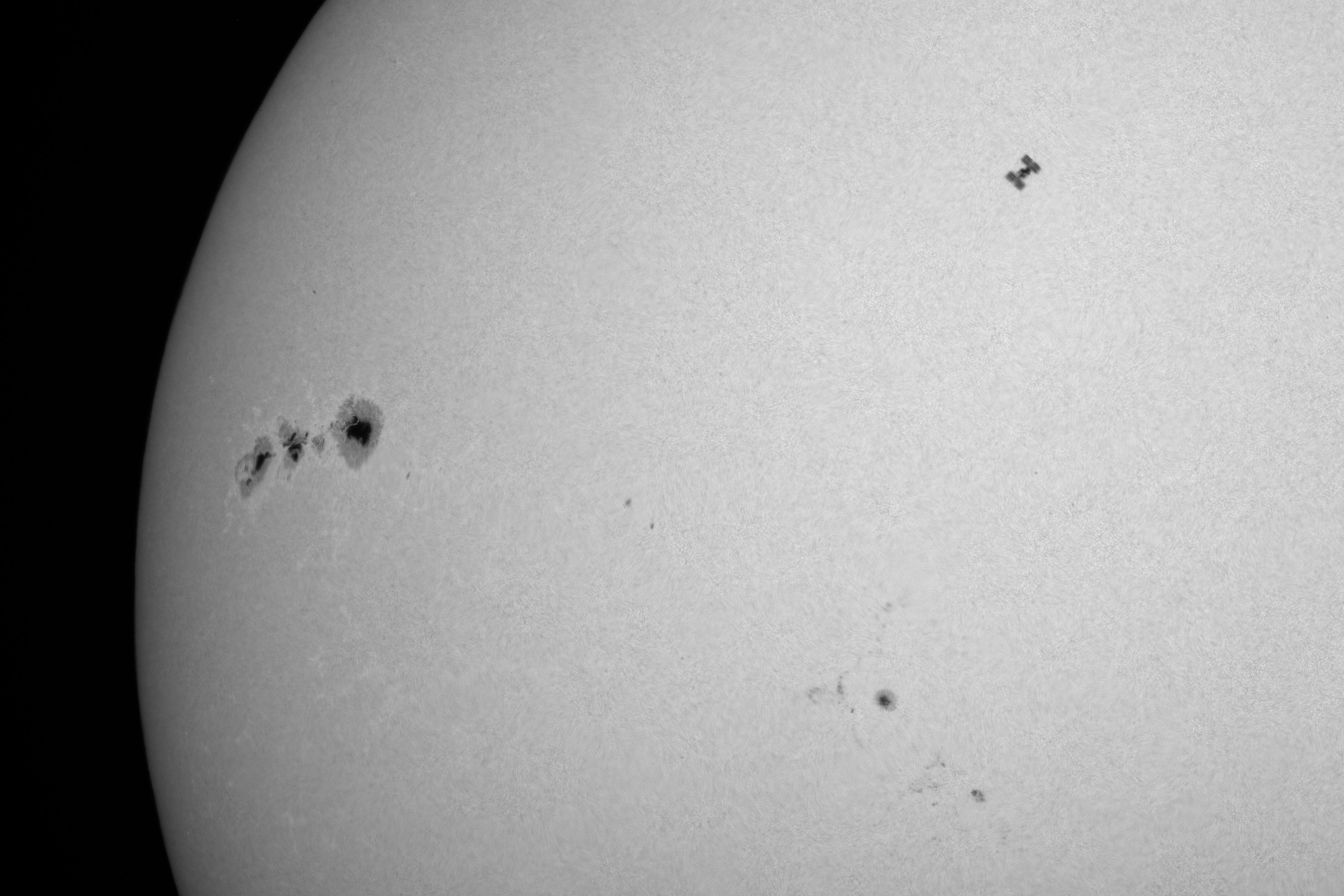 Was mir heute passiert ist, glaubt mir wahrscheinlich niemand: Ich hatte heute vormittag mit meinem Refraktor die Sonne photographiert. Als ich die Bilder auf den Rechner herunterlud, sah ich im Vorschaufenster bei einem Bild die ISS aufblitzen! Es stellte sich heraus, daß die ISS zufällig während meiner Aufnahmeserie durchs Bild lief und auf einer der Aufnahmen zu sehen war. Sowohl das Bild vorher, als auch das nachher, zeigen keine Spur der Raumstation.