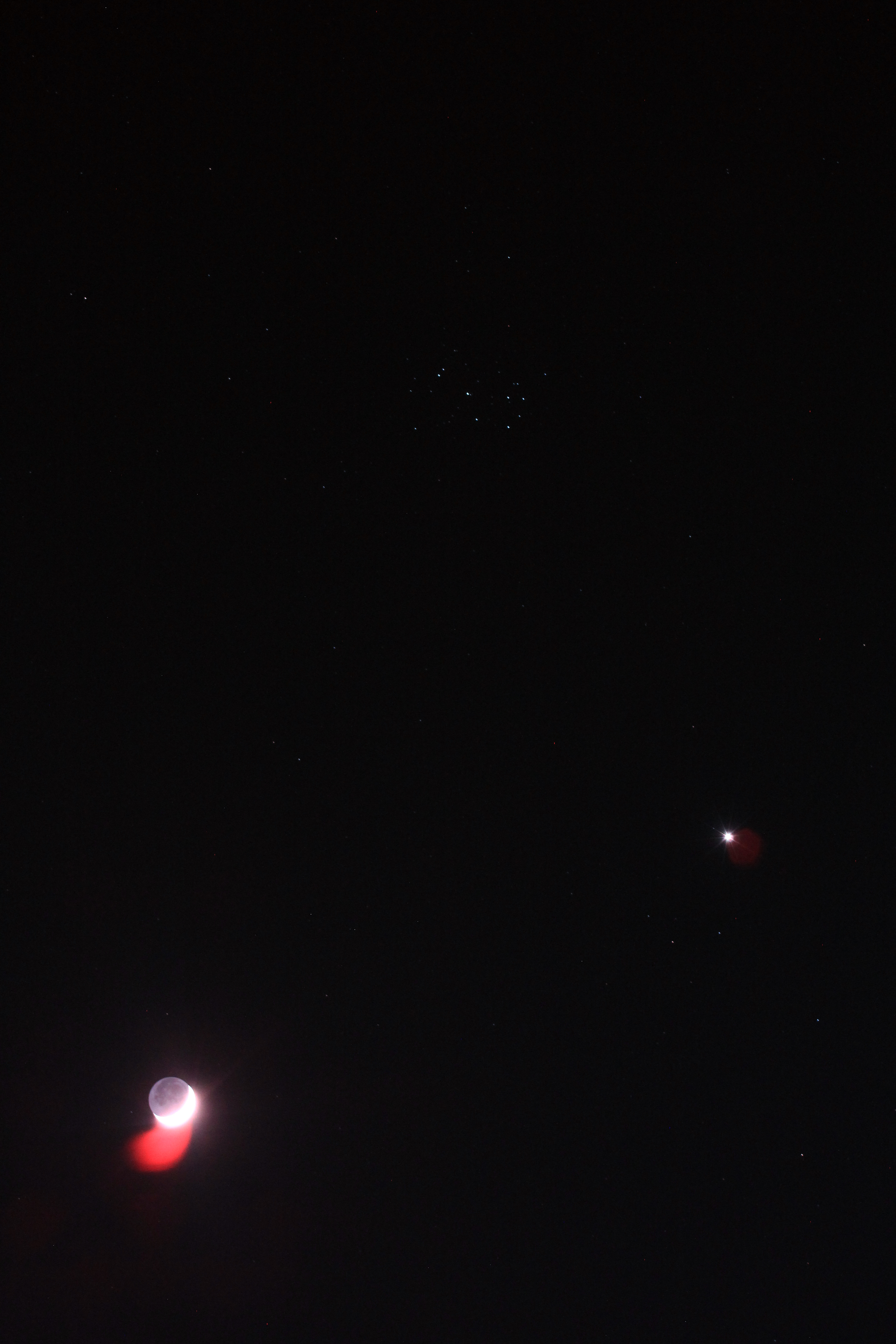 Zum Motto "Venus, Mond und die sieben Schwestern" des leider abgesagten beziehungsweise verschobenen Astronomietags ist hier ein nicht weiter bearbeiteter Schnappschuss aus dem heimischen Garten.