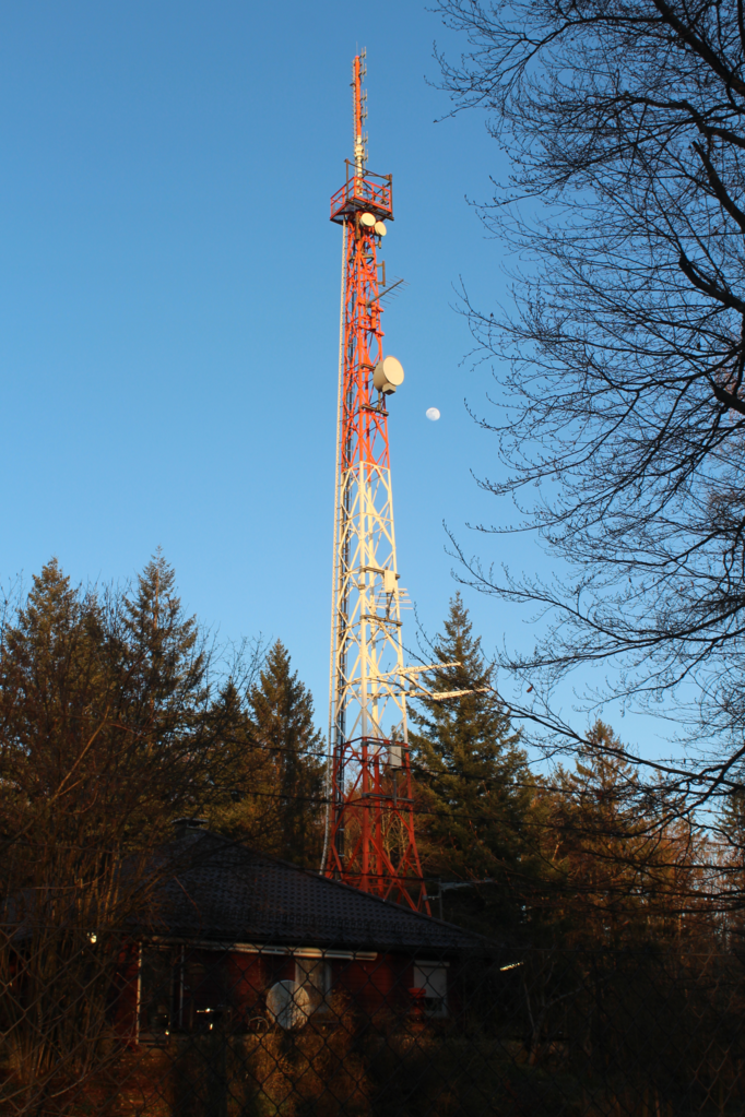 Der zunehmende Mond am Nachmittag beim 40 Meter hohen alten Sendeturm des Senders Aalen.
